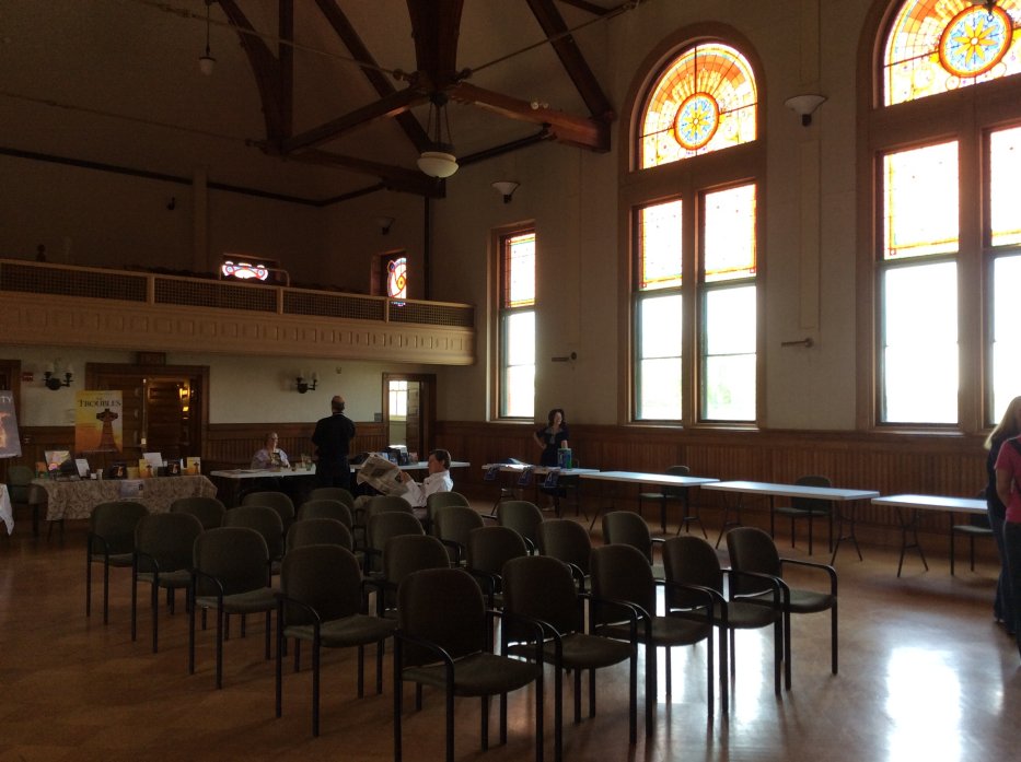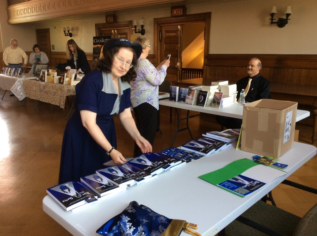 All the authors, about ten of us, Methuen7were set up in the Great Hall, an aptly named chamber with hard wood floors, tall arched windows topped with stained glass, and wood paneled walls. If you look carefully, I’m waaaay in the back right corner, contemplating how best to set up.  The line of chairs in the front of the picture faced a podium where the audience (they really did pack the seats later – honest!) sat while each of us authors gave a little chat about who we were and what we wrote.