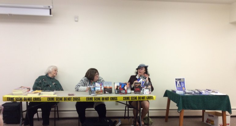 On Sunday, we took a lovely drive up to Arlington Vermont for me to join the Sisters in Crime New England panel, “The Modern Heroine.” The Martha Canfield Library is a lovely, cozy place, nestled in a valley and surrounded by beautiful Vermont mountains struggling toward green as the weather warms. As you can see, we still had some snow! The people at the library welcomed us and even provided a lovely cake to celebrate 30 years of Sisters in Crime. I joined forces with Ellen Berkeley Perry and Coralie Jensen. We had a wonderful group of people, of almost twenty, I think. They asked intelligent questions about writing and developing characters. Though my novel, set in the 1940s, might not have a, technically, modern heroine, I couldn’t help pointing out that the modern qualities of intelligence, wit, independence, determination, courage, and responsibility were strong, not only in the films of Joan Bennett, Bette Davis, Rosalind Russell, and others but in the real, rather than reel, lives of women who worked in factories and offices, raised children, nursed on the battlefield, or ferried planes. It was a fun experience – and I even sold some books!