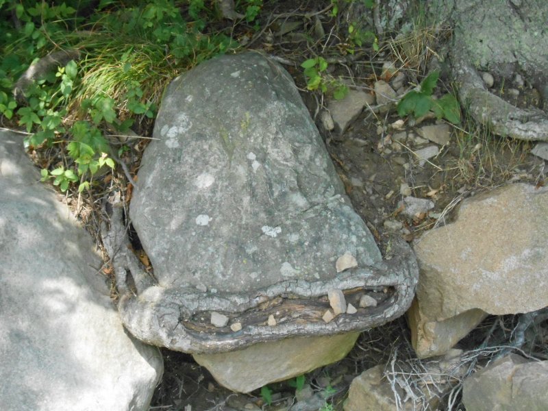 Isn’t it much like a monstrous head? Note the circles of lichen that are shaped like and located where you’d expect to see eyes. Then there are the indentations between those circles, evoking the image of a nose. How can you miss the giant, horizontally elongated mouth with crooked teeth of rock?