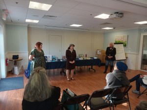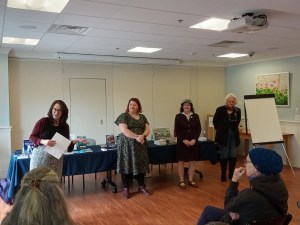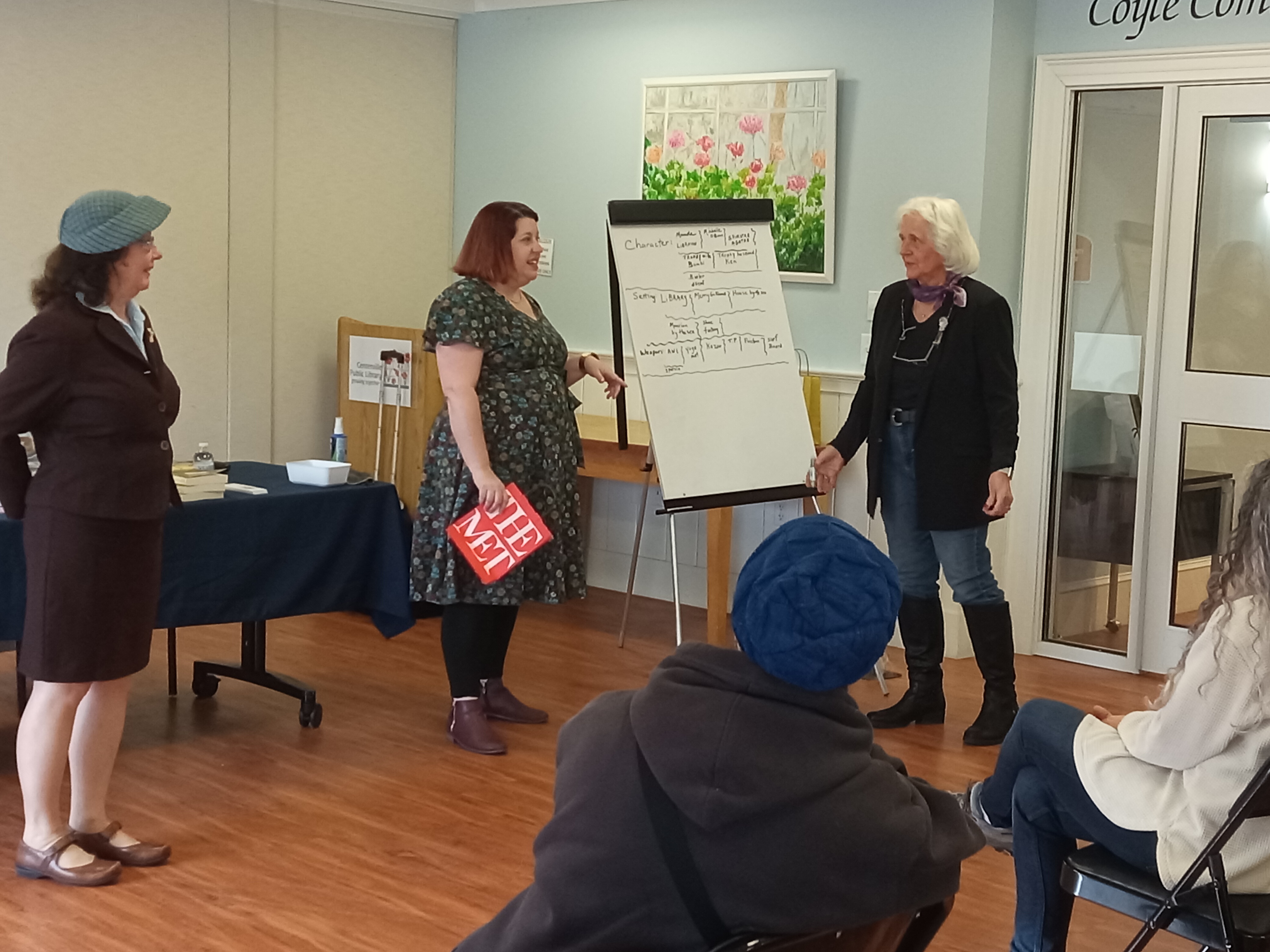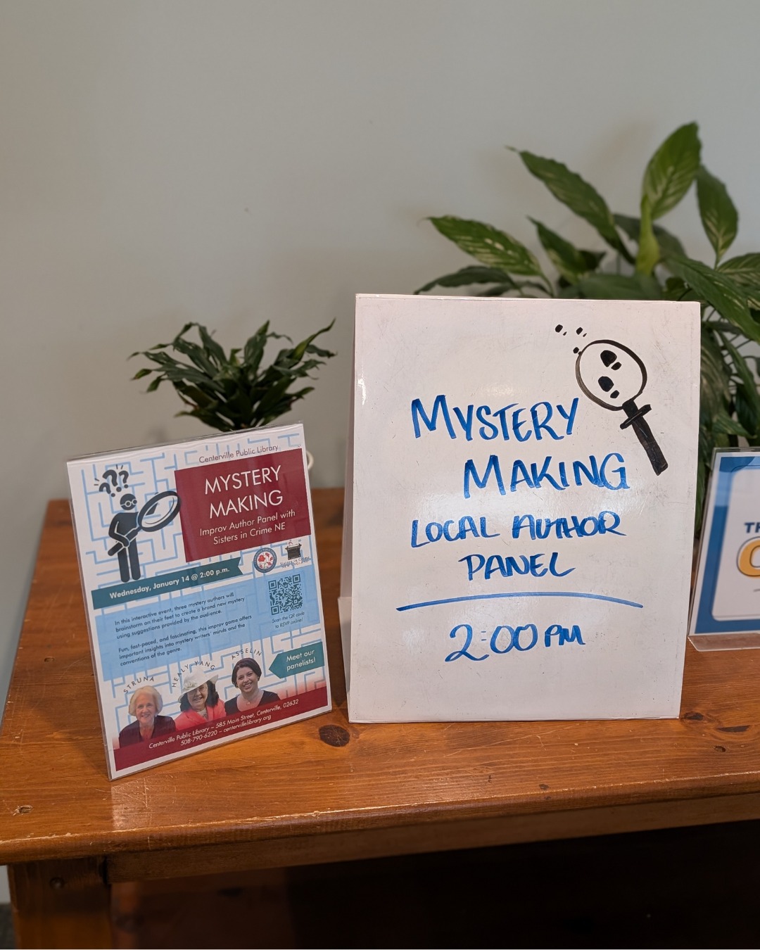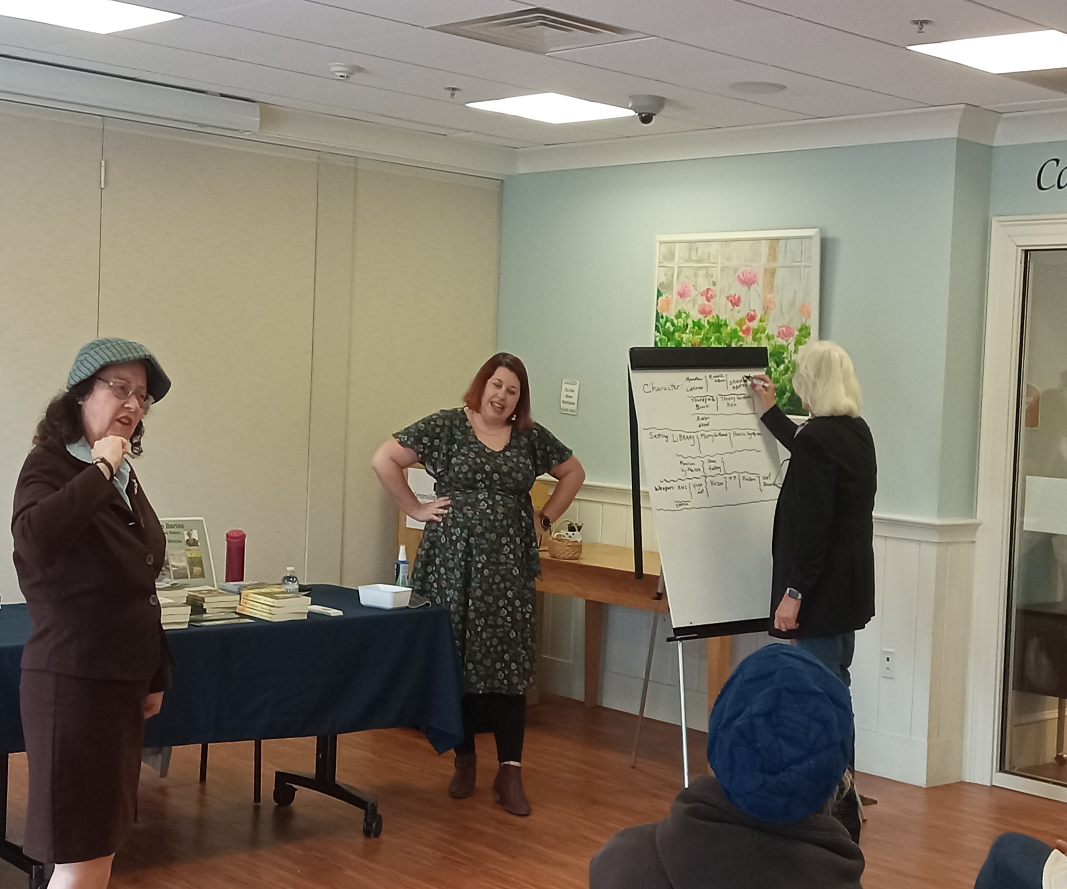 Last month, January, I joined two of my Sisters in Crime (NE) authors (Nicole Asselin and Barbara Struna)  at the Centerville Library on the Cape for a fun presentation:  “Mystery Making .”  The Speakers Bureau of Sisters in Crime New England offers loads of exciting, informative, and enjoyable programs, but this is one of the most popular.  The audience gets to help us create a mystery  right before their eyes!