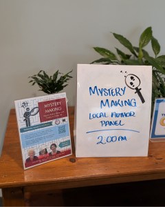 How is this mutual creation accomplished?  I’ve seen slight variations of this method, but here’s what usually happens on the presentations in which I’ve been involved. We, the writers, collect anonymous suggestions from the audience in bags marked “names,” weapons,” “motives,” and “setting.” Then we pull suggestions from the bags without looking – well, we look enough to see that we actually get our hands in the bag – reveal what we see, then post it on a white board at the front of the room.  We really get the ball rolling by each making  suggestions and cooperatively shaping characters to go with names, shaping those characters’ lives in terms of setting.  Pulling together how setting and character relationships create motive and how all three are reflexively related to the weapon(s) used.  Of course, the order of the discussion might change at different events, but our joking interplay always brings out how all the elements in creating a mystery are interlinked.