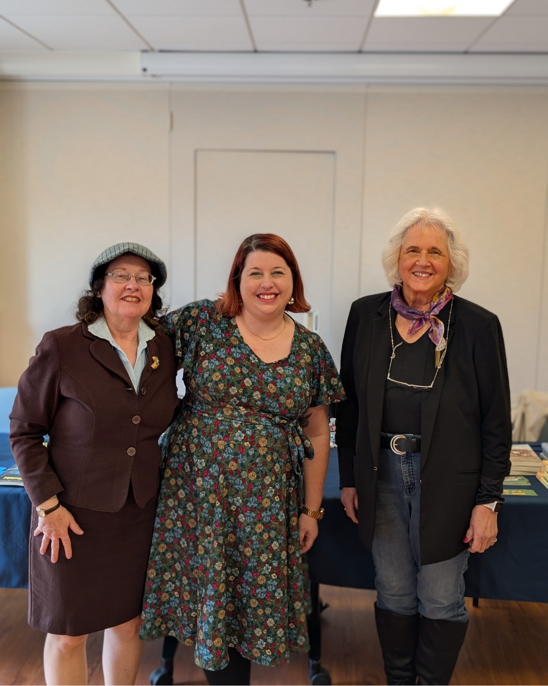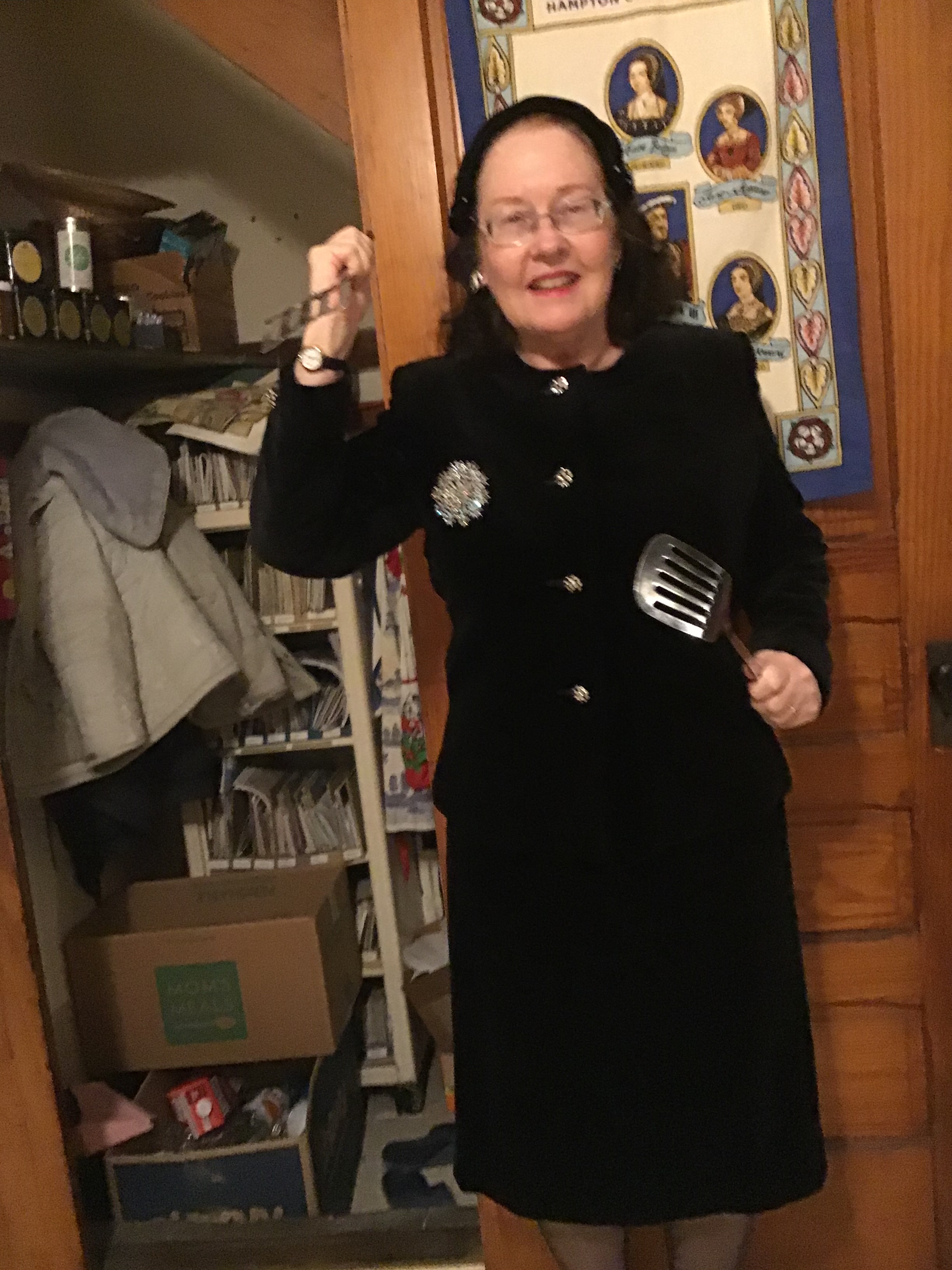 Next on the agenda was a Sisters in Crime New England Mystery Making Night at the West Boylston Library, also in Mass.  I had the privilege of working with two good buddies, Janet Raye Stevens and Carol Goodman Kaufman.  I joked to them that with me (Sharon Healy Yang) joining them, it looked as if it was a requirement to have three names to be on the panel .  We had a ball weaving the suggestions of our audience into a tale of murder on a cruise ship involving an ice pick, secret identities, and ice cream.  You had to be there.  I decided to combine the holiday ambience with my 1940s fashions to wear a black and white pin-striped suit, autumn gold blouse, and peaked chapeau that is two-parts wicked witch and two parts 1943 fashion!