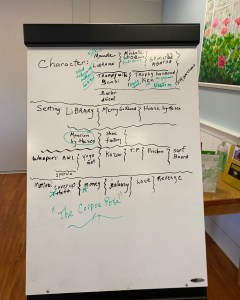 Especially fun is the audience’s participation, as they help create the mystery novel, not just by their suggestions on the anonymous paper slips, but as we gradually invite them in for more and more participation in drawing the elements of writing a mystery into a final form.  It’s a blast to hear people arguing over what weapons are plausible and which are not (big argument over the efficacy of spatulas), or helping us weave a plot in a setting where weapons like a surf board, a yoga mat, an awl, a kazoo, and, (yes) even a spatula can be elements of doom. Really neat, a member of the audience suggested that if the yoga mat would be involved in the murder, we should call the book Savasana:  The Corpse Pose.