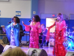 Yang and I were delighted to find our friends Tom and Barbara almost immediately; and, after some fun chatting, we settled down for the opening act of a local band, the Reminisants [sic].  Then, after intermission our favorite ladies appeared looking glorious, glamorous, and elegant to let us in for a full hour and a half of high energy Motown magic.  Scherrie, Susaye, and Joyce performed with vivacity  and delight.  They were having as a good a time as the rest of us in the audience, as we bounced and bopped along with them to Supremes’ hits and new songs.  Their harmonies were impeccable and exhilarating; when each lady took the lead, her powerful voice carried the feeling and life of the song.  It was especially fun that they did some of the hits by Dawn, the group that Joyce helped make famous.  So good to hear her come out of the background.  She has a strong and beautiful voice.  I can’t stress enough how good these ladies sounded.  Interestingly, as Susaye and Joyce were telling me later, when Mary Wilson left the Supremes, the group was supposed to continue with Joyce as a member.  Isn’t it  a pity that Motown hadn’t let us have a great two-for-one-split:  solo Mary Wilson and Susaye, Scherrie, and Joyce continuing the Supremes.  At least we have them together now!  They haven’t lost a jot of their talent – or energy!  See: in this picture, Scherrie and Susaye are moving so fast that they are going interdimensional!