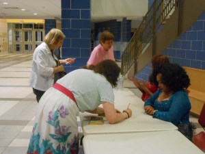 I didn’t get a chance to have my picture taken with Mary (I’ve got to learn to be more aggressive, just not when marywilson6she’s rushing to do her next show, though).  Maybe next time.  Anyway, here are some shots of me in the same frame with Mary – and Tom, too!  Look, she’s checking out the cover of the notebook in which I had her sign.  She loved the cover, which, incidentally, was  done by the artist parents of one of my husband’s former students.  Swoooon, she’s writing in my book and returning it to me!