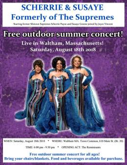 Last week or so, my good friend Tom Ingrassia (savant of all things Motown) posted on his Facebook feed that Scherrie and Susaye, former ladies of the Supremes (FLOS), who had united with Joyce Vincent, were going to be performing a free concert at the Waltham Summer Concert series.  Being a Supremes devotee, I was primed for that concert!  It was the perfect way for Yang and I to kick off our anniversary celebrations.  Still, the monsoons of rain besetting New England this summer had us on tenterhooks.  Would the outdoor concert be cancelled?  No!  It was moved to the high school field house, a modern and pleasant set up.  We were on for a supreme night of entertainment!
