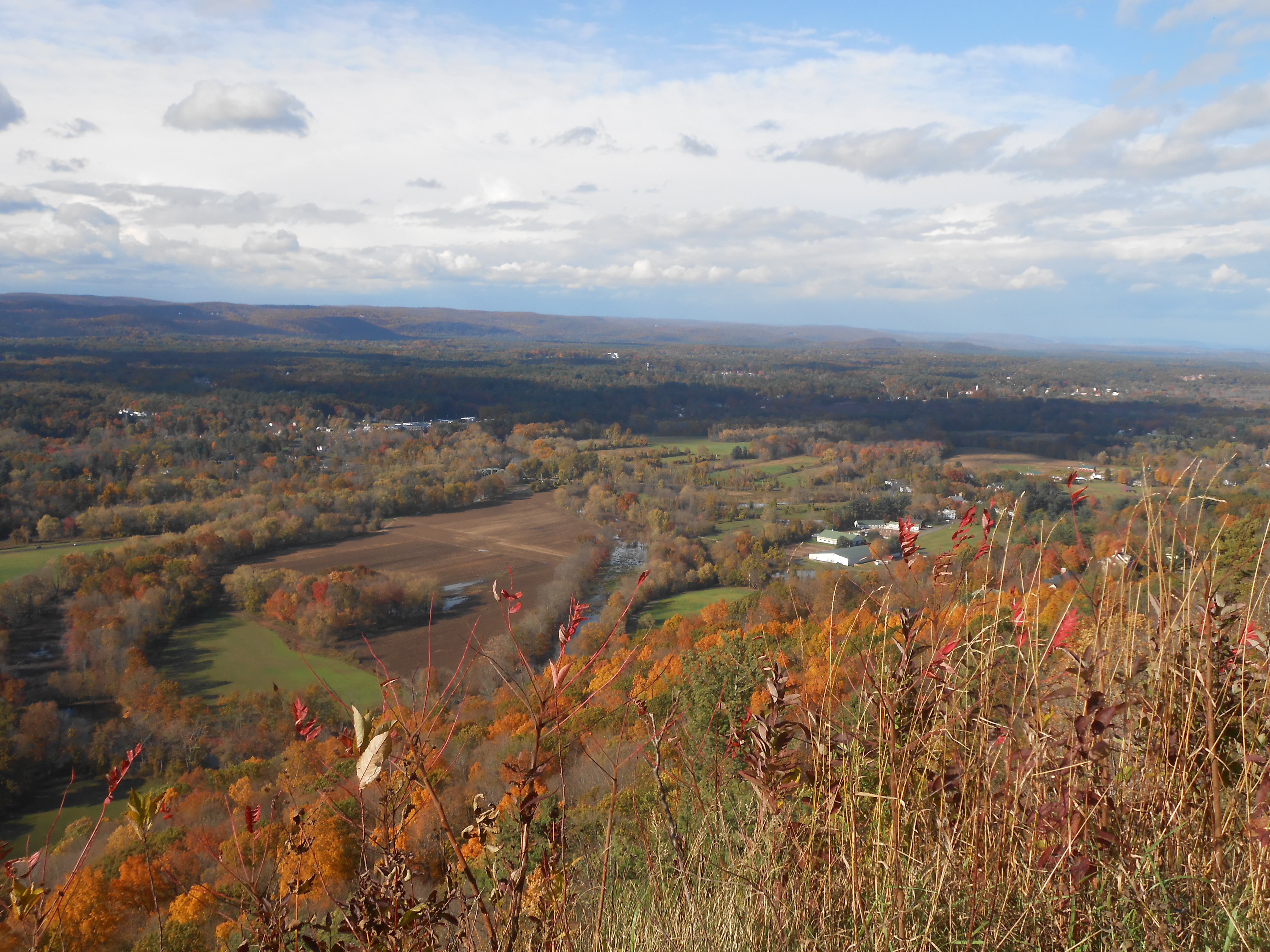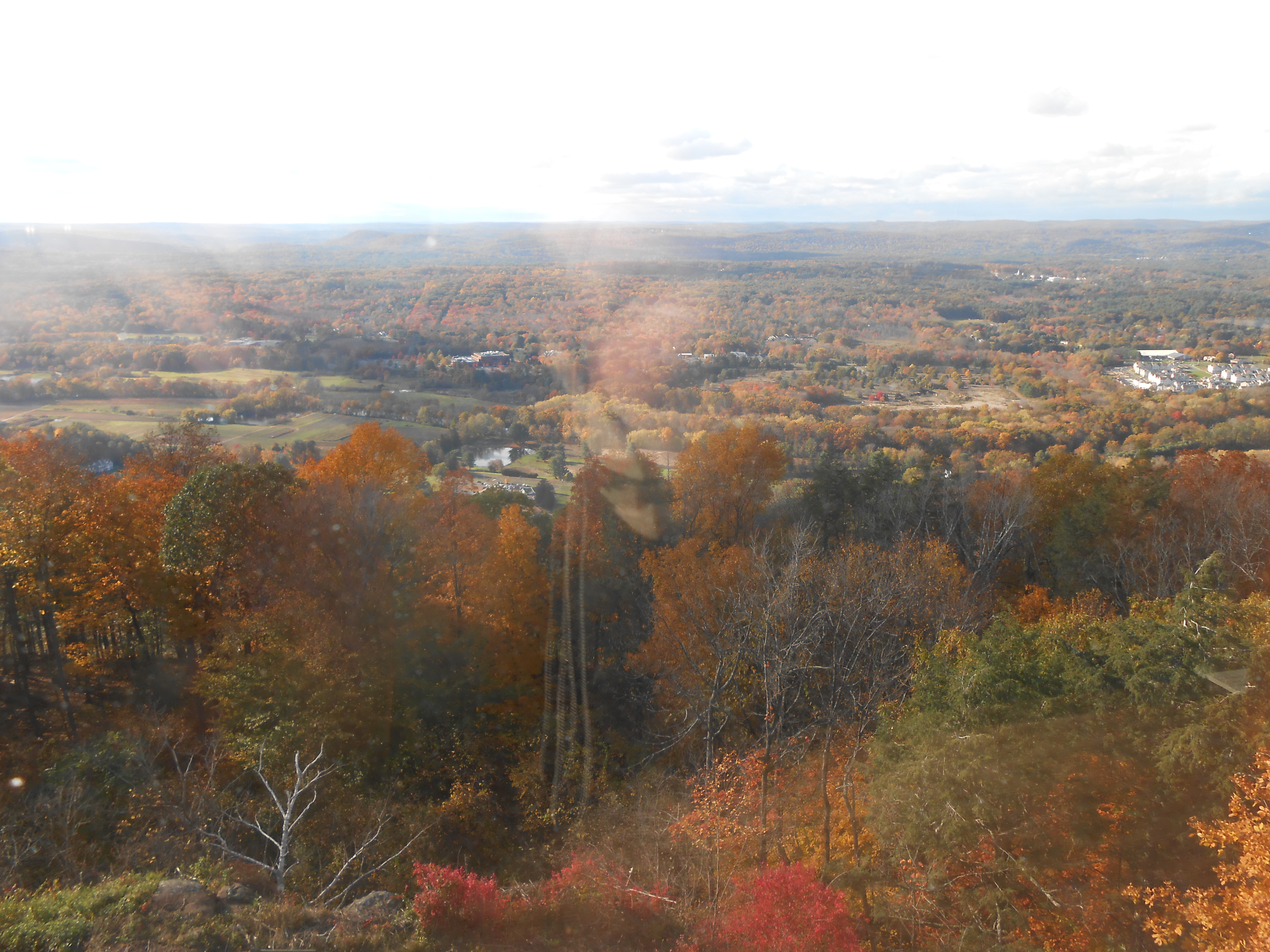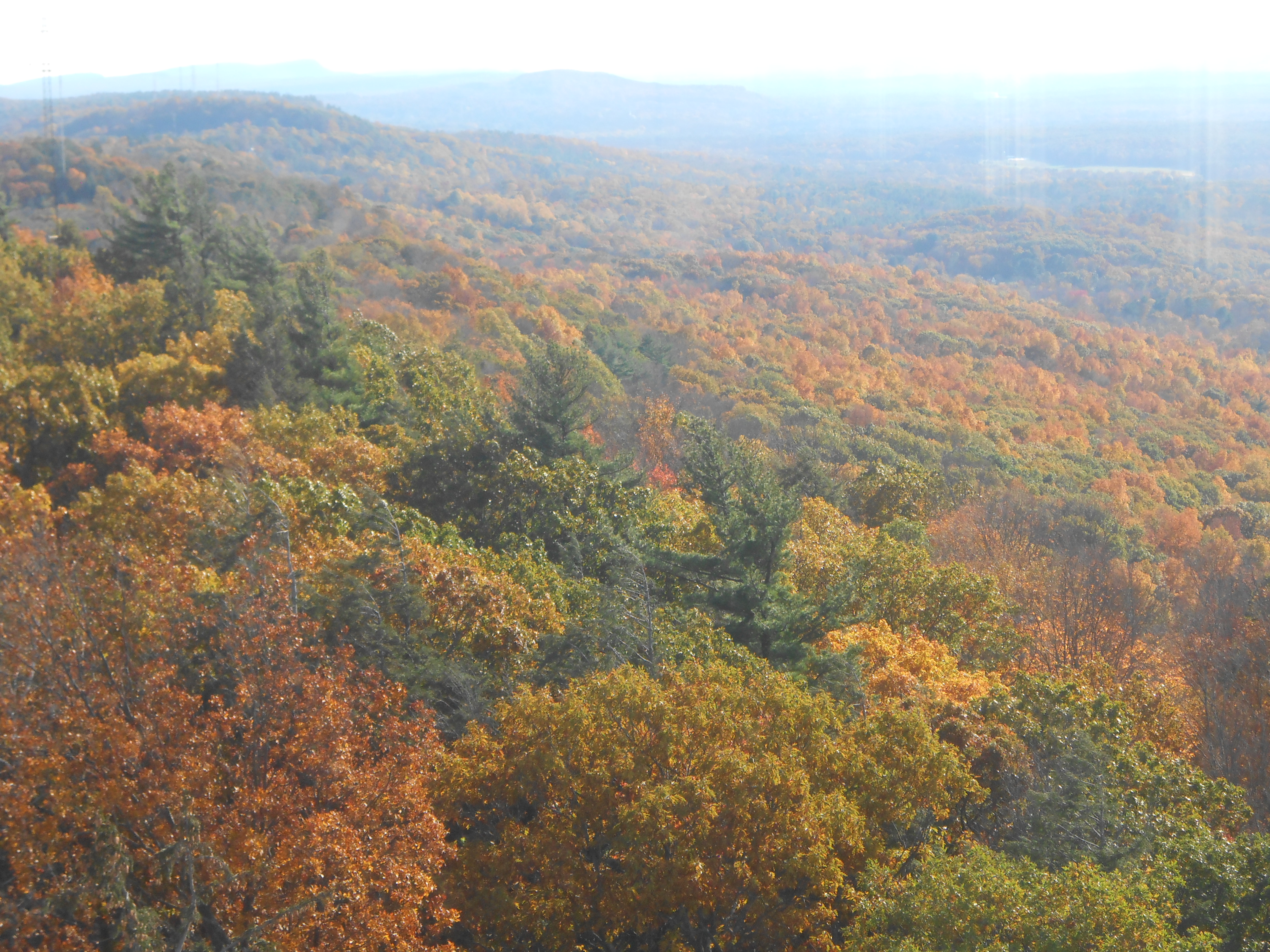Hiking up the mountain isn’t too bad a hike at all.  There are several trails to get to the Tower.  The most popular one is a little steep at first, through autumn woods, but there are benches along the way if you’re out of shape and need a rest.  We were in good enough shape not to!  Then, you come out of the woods and onto a ridge overlooking the valley below.  The view along this ridge is wonderful, and you might even see a hawk as we did! Some great overlooks.