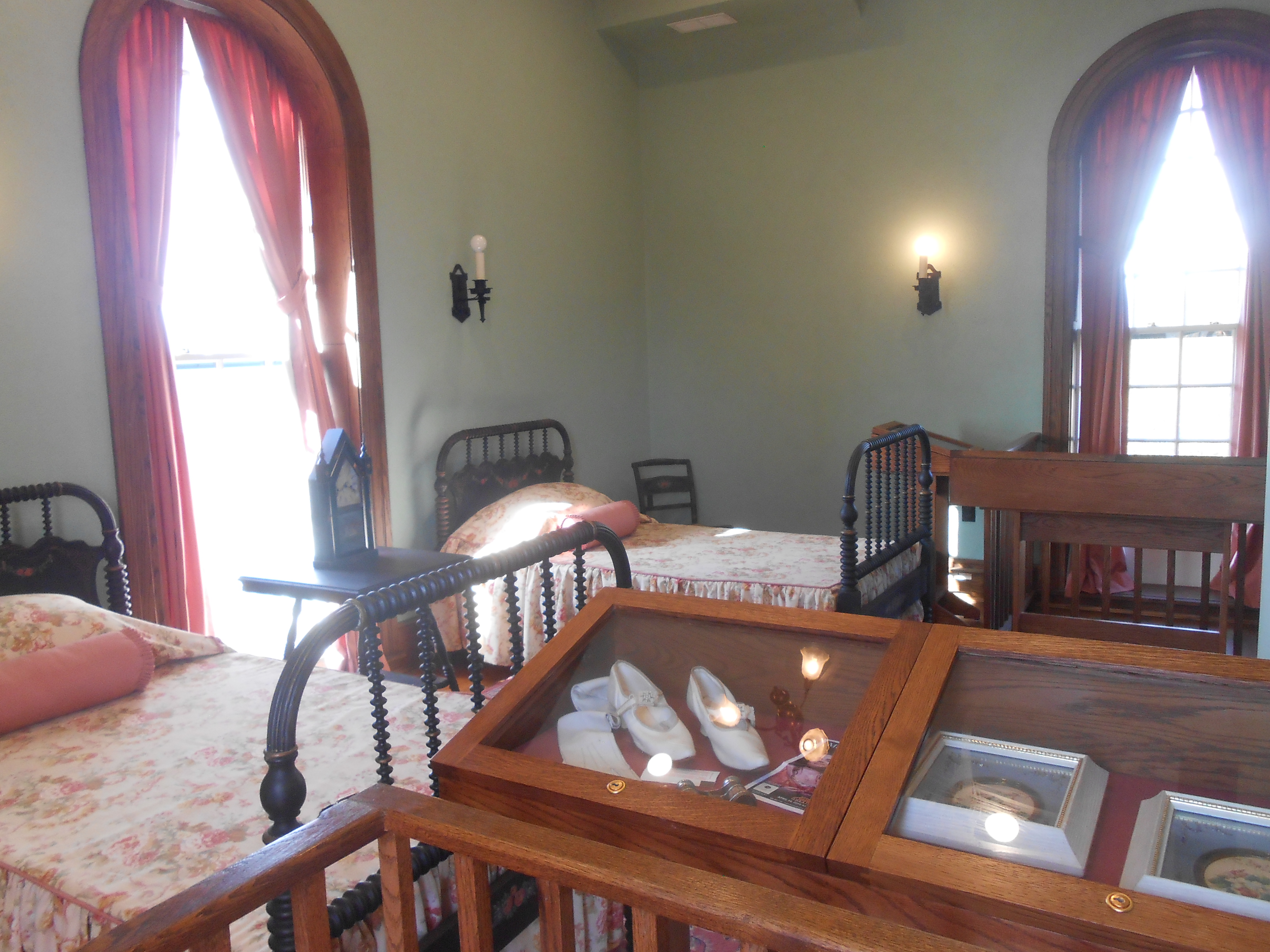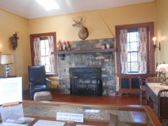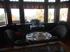 The Tower itself is quite a treat!  This old photo shows what the foyer and living room originally looked like.  My shot lets you see an updated in-color version.  The furnishings have been carefully assembled to approximate the style and taste of the original era.  Though I’m not sure I would have wanted a big deer head on my wall, I would have loved to relax before that fireplace in a comfy chair or to play card games with friends on a crisp fall evening, with coffee or tea and scones for sustenance.  And how about this nook by the window that looks out over a gorgeous mountain landscape, cascading fall colors into the valley below?  How’s that for having breakfast or an afternoon tea?  I wonder  what flavor that cake is on the table?