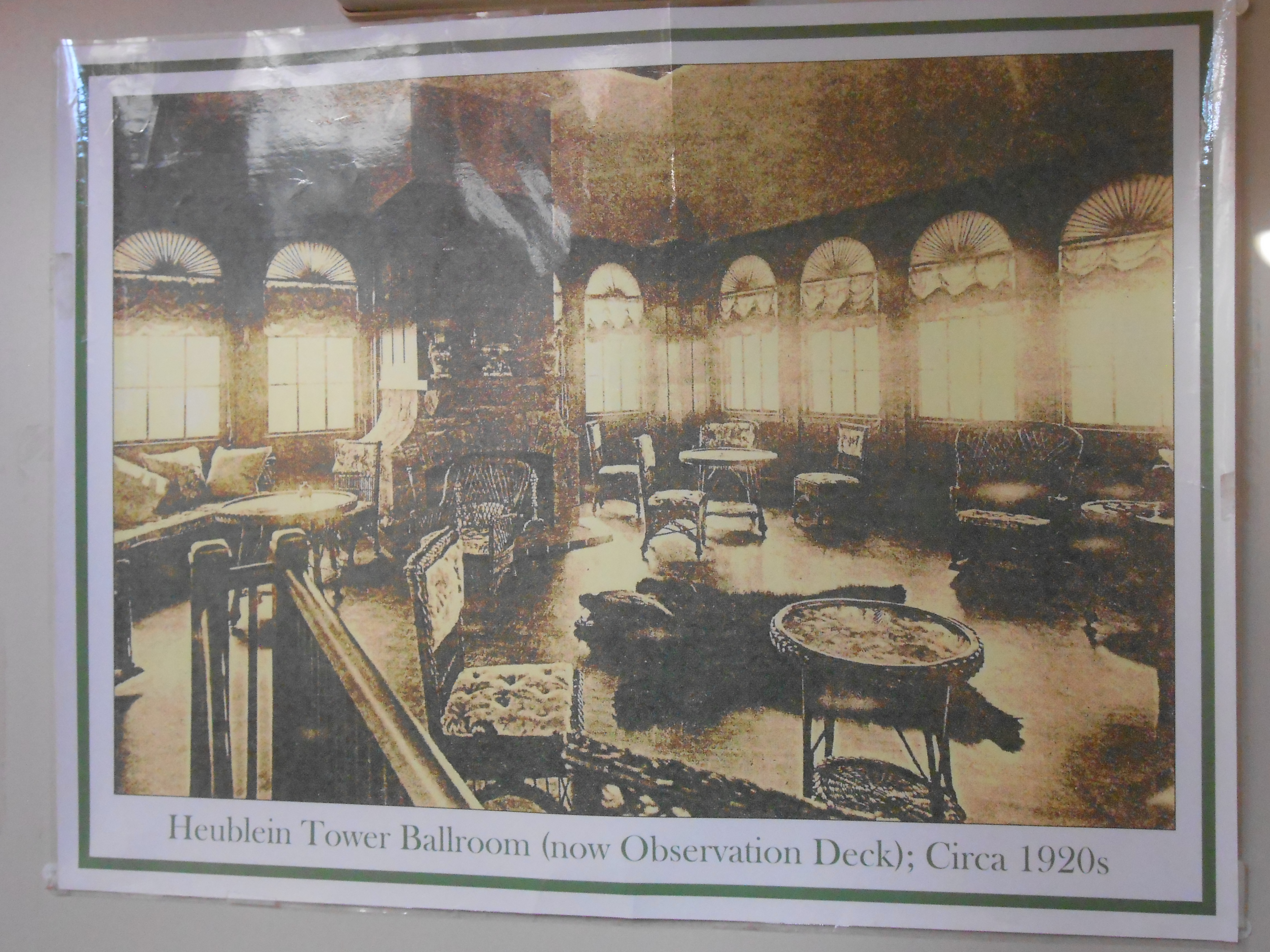 One of the most interesting parts of the Tower is the observation deck.  Originally, this area was known as the ballroom, as you can see from this old image of the earlier set up.  Wouldn’t it be grand to dance away the evening on these hard wood floors?  It could be a real Stardust Ballroom, with the twinkling lights of the darkened heavens glittering through the tall windows of all four sides of the room.  Of course, you’d have to move away all that furniture.  Great place for a big party!