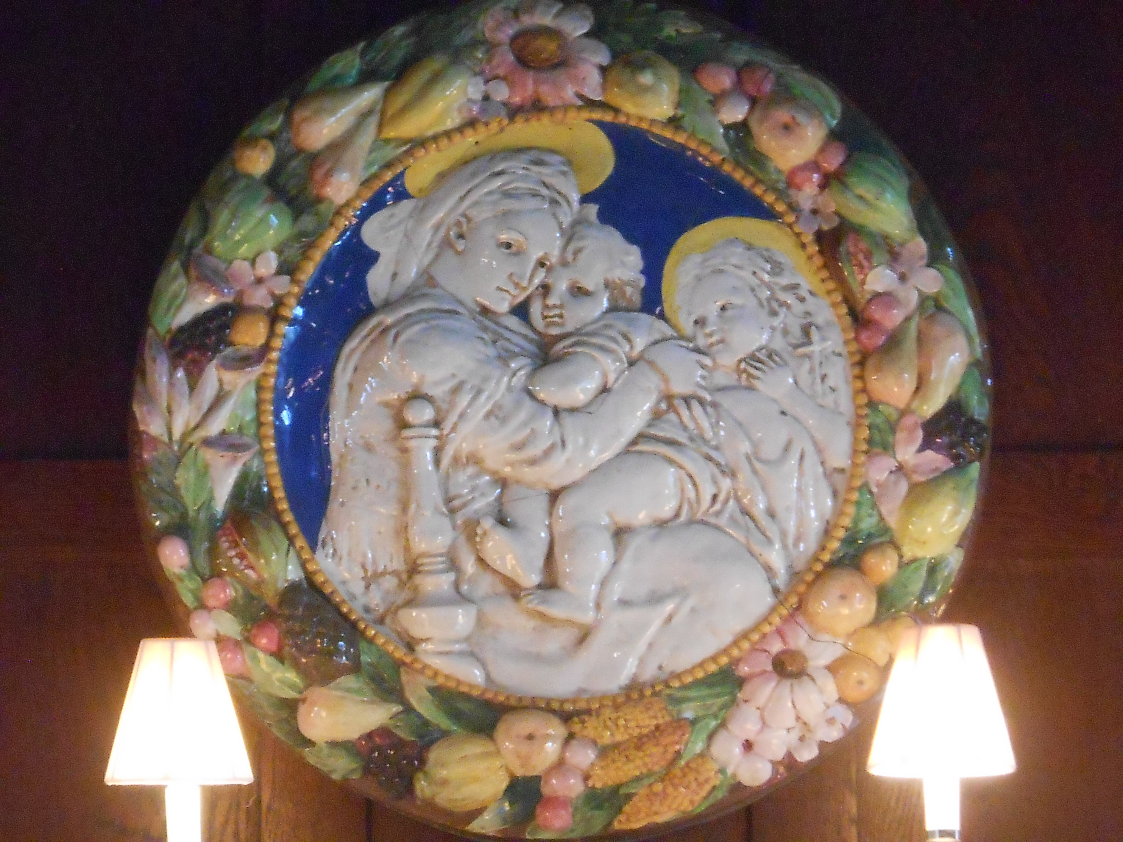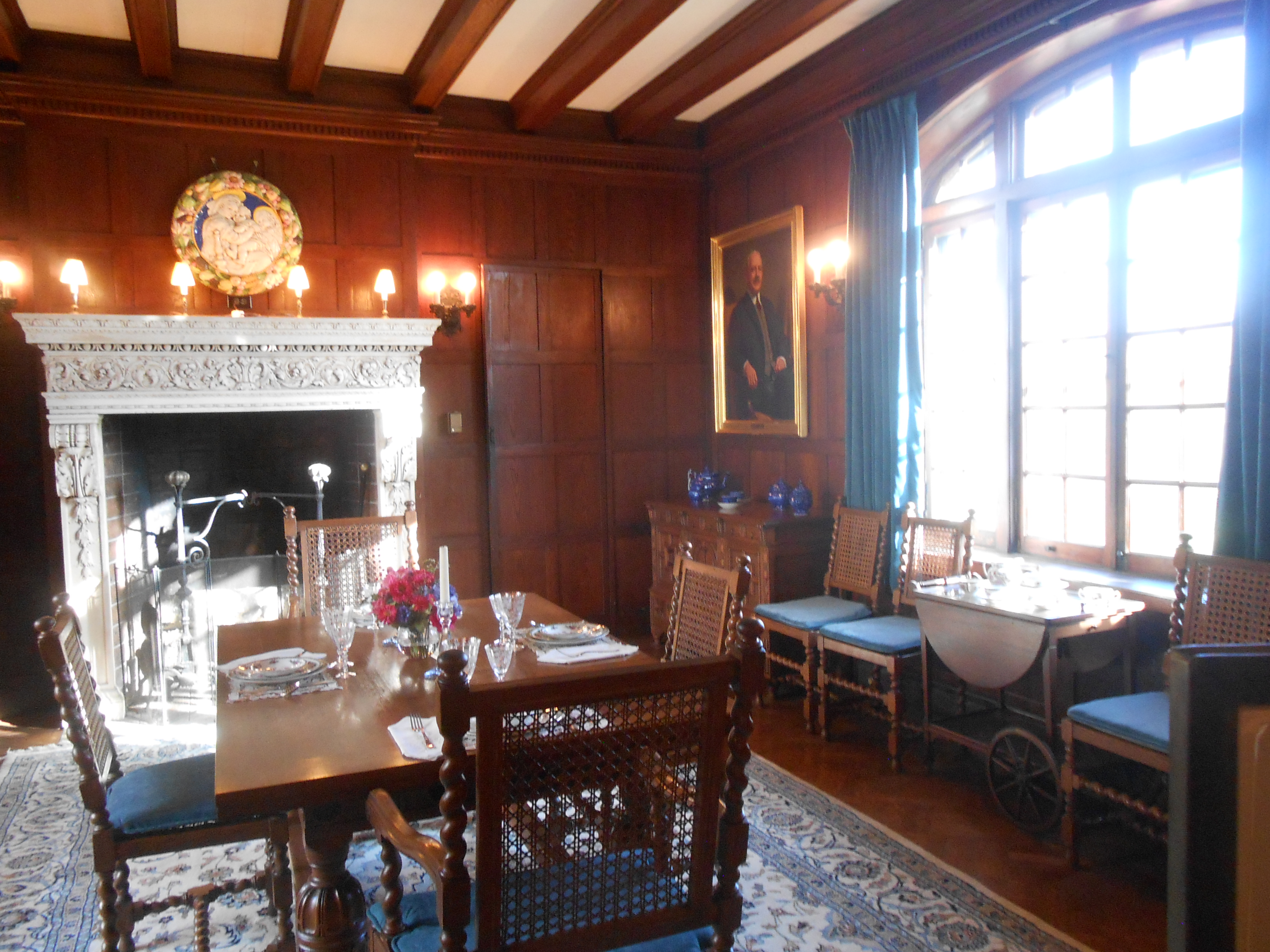 Finally, returning to the first floor, towards the rear of the building, you find the formal dining room, gorgeous in wood paneling, dark wood furniture, marble fireplace, exquisite Persian rug, elegant china and cutlery, and painted medallion above the fireplace.  How about the gorgeous beamed ceilings? It’s fun to notice that the door to the butler’s pantry is hidden in the shape of the paneling on one side of the fireplace, while a closet is similarly hidden on the other.  Light pours in the windows.