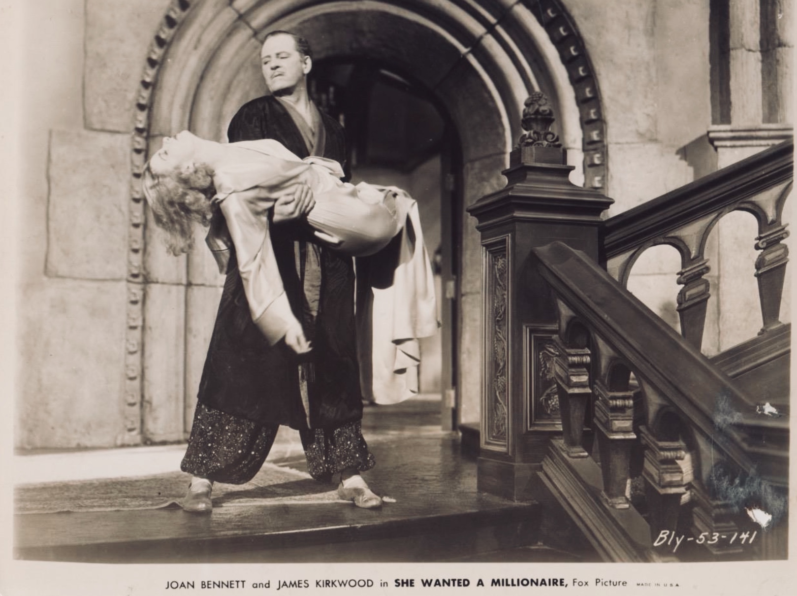 Anyway, Yang and I saw two films I’d never seen before:  She Wanted a Millionaire and Weekends OnlyHush Money had also been on the bill, but Disney forced the festival to pull it in a legal CYA move.  That’s the technical term my lawyer nephew gave me.  God bless UCLA for going to bat for the festival and still getting us these two films.  They were something else.  Millionaire is a humdinger, starting out as a romantic comedy and turning into a Gothic piece with a sadistic husband who lures a naif into marriage, using the typical secret passages, peep holes, and untrustworthy servants in his isolated, creepy mansion, but modernizing Otranto’s castle with high tech (for ’32) listening devices.  His manipulations, viciousness, and violence would give Manfred, Brother Ambrose, and Schedoni a run for their money.  Joan does get up the gumption to hang tough and give her tormentor what for; but, darn it all, they have her faint at a crucial moment.  They just had to go all Victorian, didn’t they? Victorian, with the exception of Margaret Hale in North and South, who has to get hit in the head with a rock to go down for the count.
