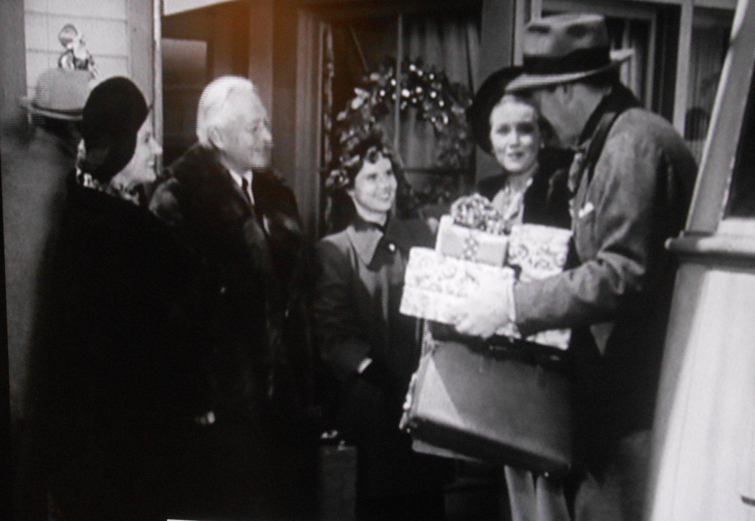 On the surface, the holiday season seems to characterize this small town as an embodiment the idyllic. Right off the bat, we’re immersed in Christmas cheer and fellowship, as the investigator helps a young woman, Anita Weatherby, returning to her family, so packed with presents that they burst from her arms and off the train.  His Christmas good will in helping her is rewarded by her friendly, joking family inviting this helpful stranger to their house.  He accepts their invitation to visit and share in the brightness, warmth, and humor of their home, filled with cheery Christmas decorations.  Still, the family is not cloyingly saccharine, instead, kidding him and one another pointedly but good naturedly. In the same mood, Doro Merandes plays their housekeeper, Hilda, in Margaret-Hamilton-style – not as a Wicked Witch of the West but with salty comments delivered in perfect dead pan.  That Mr. Weatherby, the pater familias, carries the authority of bank president seems to indicate that his warmth, tempered by dry humor, is the characteristic mode of the town.