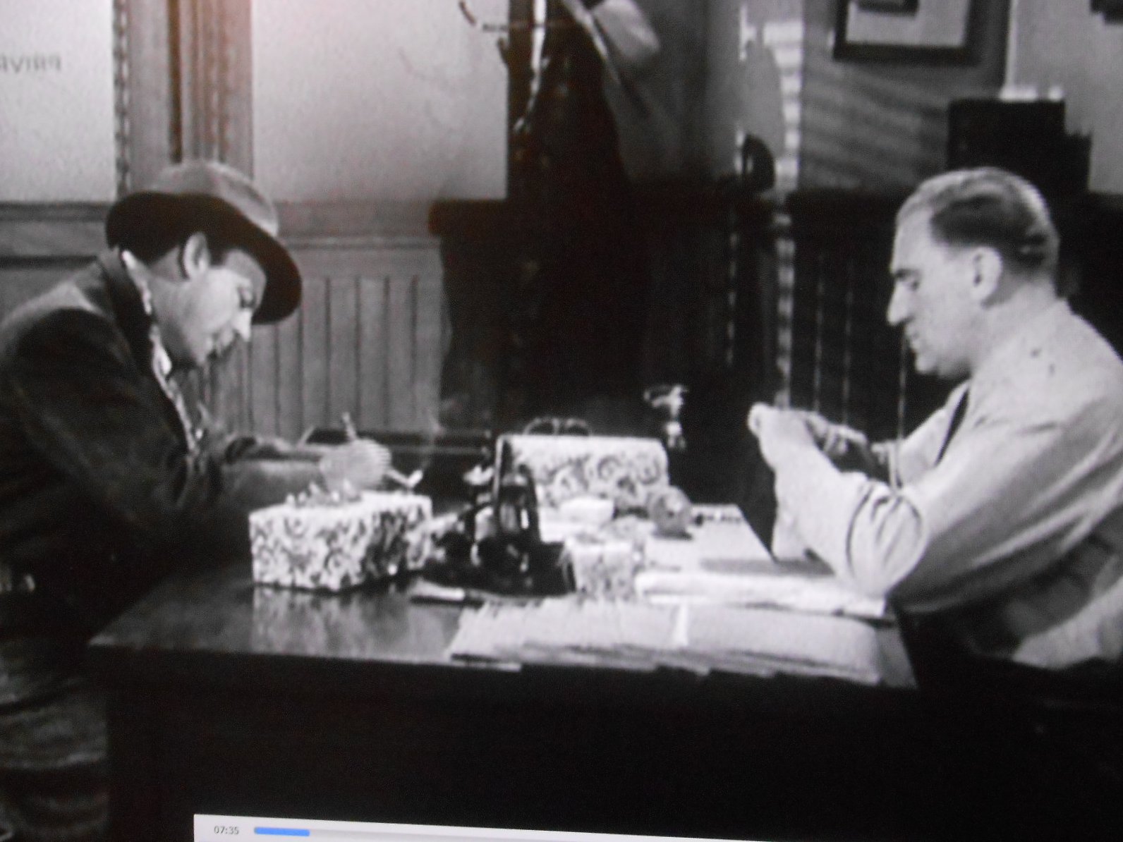 This image from the first meeting of sheriff and investigator, where they sit down to parry verdicts back and forth brings this point home.  They are seated on opposite sides of a desk, like opponents in a chess match.  The Christmas presents  between the two in the shot do not bond them in seasonal amity, but form a barrier between opposing forces – visually emphasizing a subversion of “Christmas fellowship” as much as the men’s amiable sounding but antagonistic verbal sparring and both refusing to face the other. A wreath above and between them, just out of shop, reinforces this point. Even more sinister, in the denouement, a tone of easy good will coats but does not hide the two men’s opposition.  When Sam pleasantly checks Best by pointing out that neither has ascendancy because both carry concealed guns, Best chillingly checkmates him with the easy and reasonable delivery of his assertion that if Sam shoots him it’s killing “a law man,” but “If I [the sheriff] get you with my gun . . .it’s just a lot of votes in the next election.”