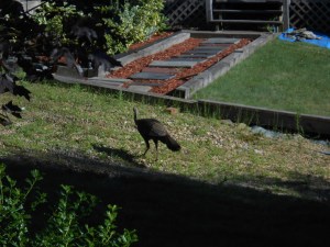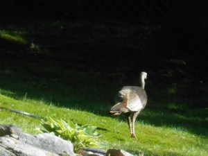 Another neighbor’s cat tried to stalk the turkey a couple of times and was ignored at first. Then he made a charge and that bird just did one arched extension of the wings – Clover took off. My cats enjoyed watching that, since Clover was on their turf.