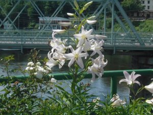 Last weekend, we had a mini-vacation in Vermont, connected to my day at Bookstock. What a great time! We’re so fortunate to be living in New England. Friday afternoon, we took a leisurely drive up to Brattleboro to have an early supper at our favorite bakery on Main Street. In a space overlooking the river and mountain, we watched a thunderstorm roll in while we enjoyed a scrumptious olive tapenade/goat cheese/walnut salad and a cappuccino. The storm passed; we rolled out for Springfield, Vermont and the Toonerville Rail Trail.