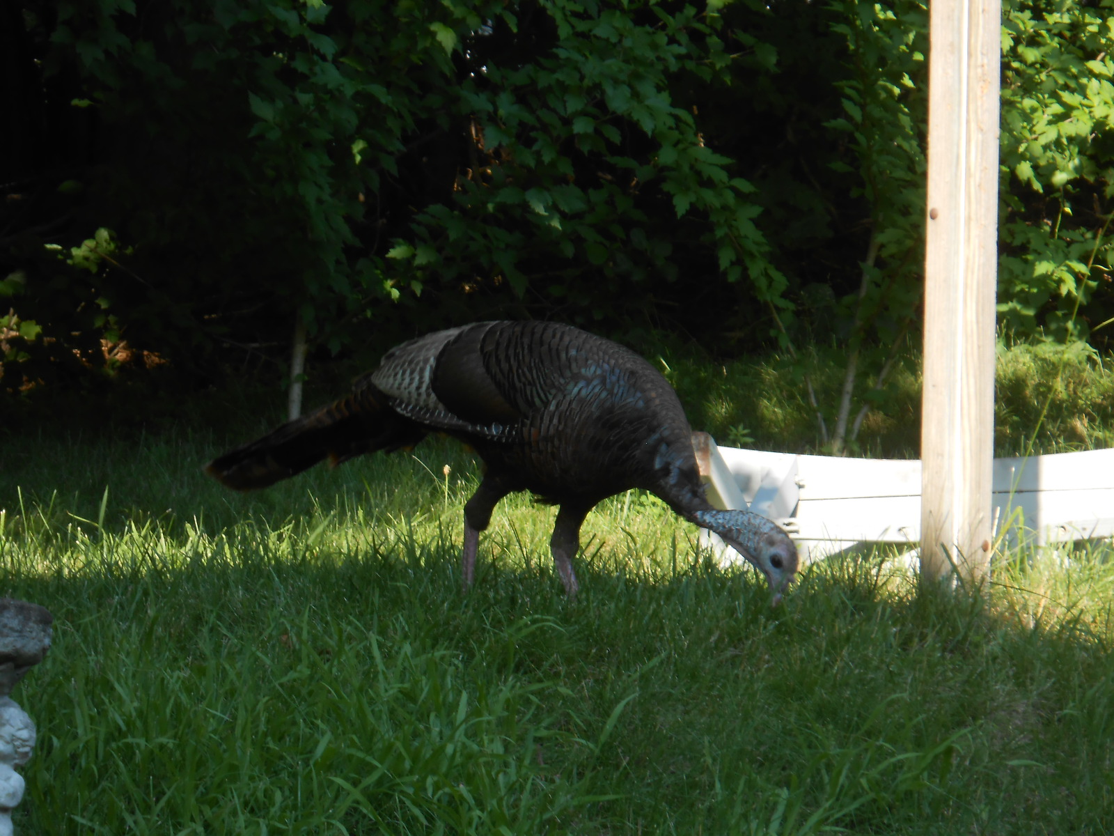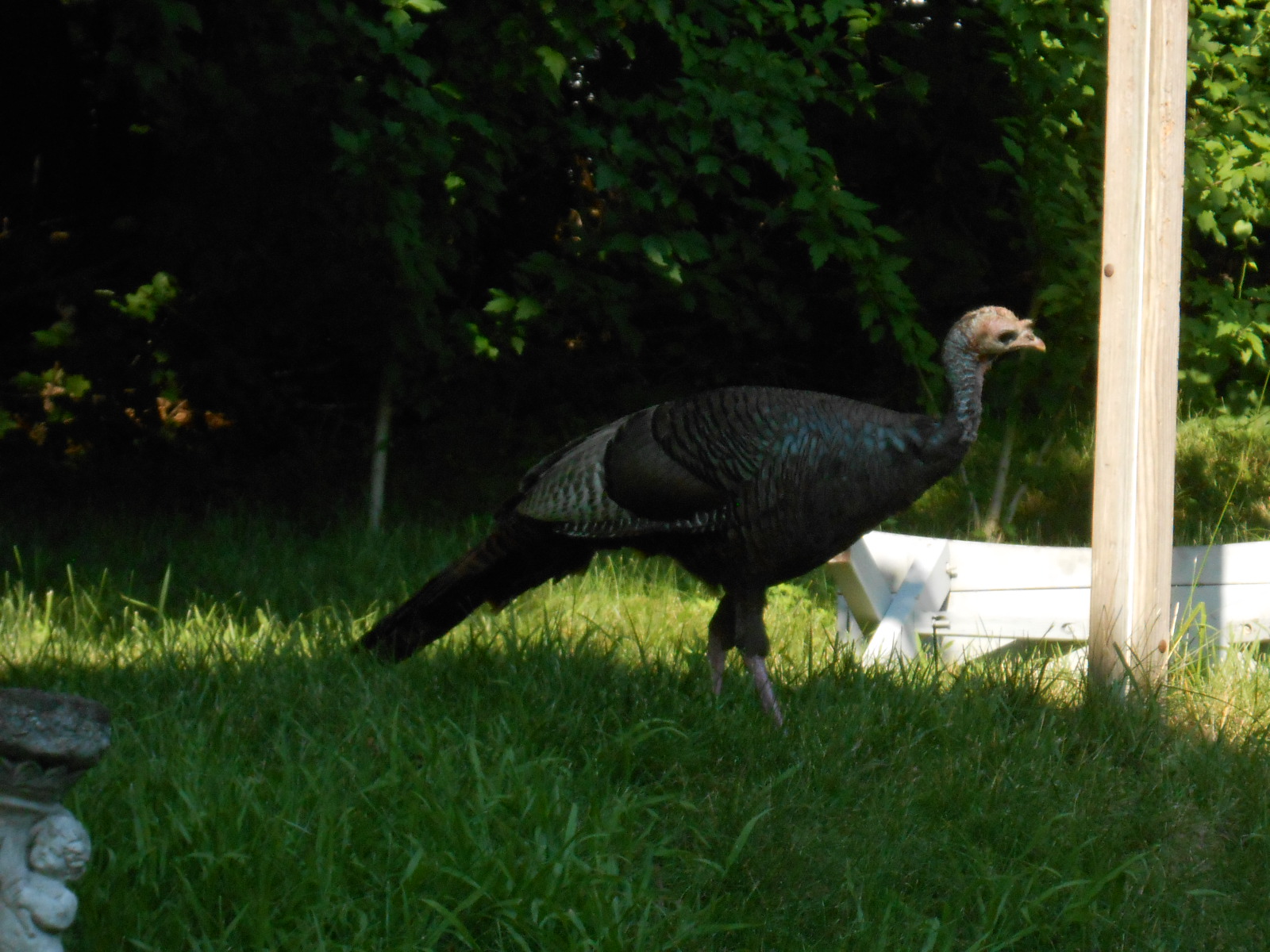 Another neighbor’s cat tried to stalk the turkey a couple of times and was ignored at first. Then he made a charge and that bird just did one arched extension of the wings – Clover took off. My cats enjoyed watching that, since Clover was on their turf.