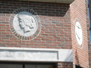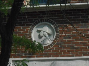 On another building, I found these reliefs:  a pilgrim-looking guy and the female head from the old dimes.  How wise to pick a relief that has rays coming from her head that can also double as pigeon repellers. Note that anchor relief just around the corner.