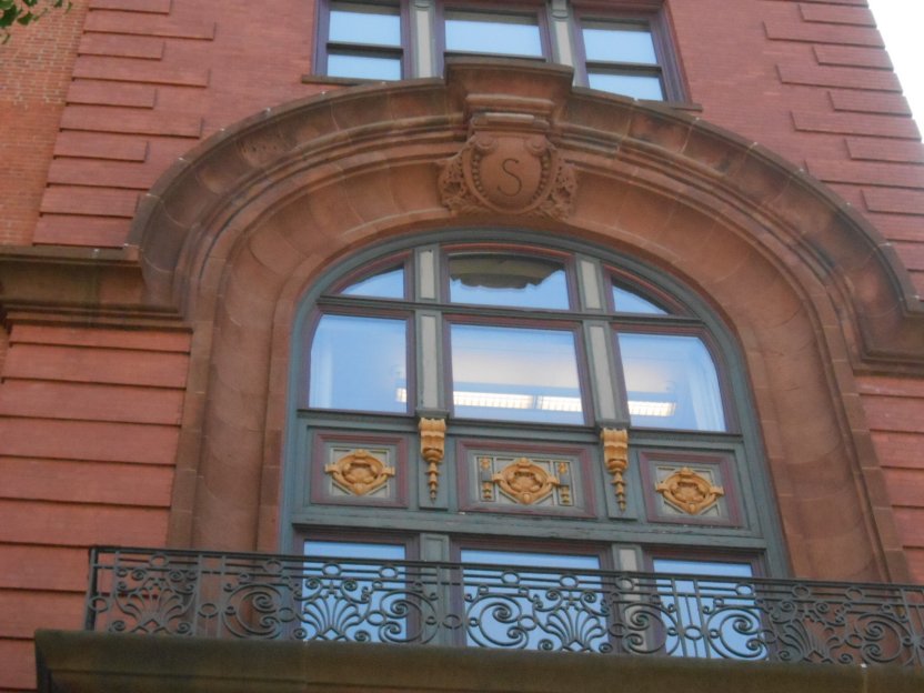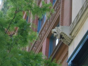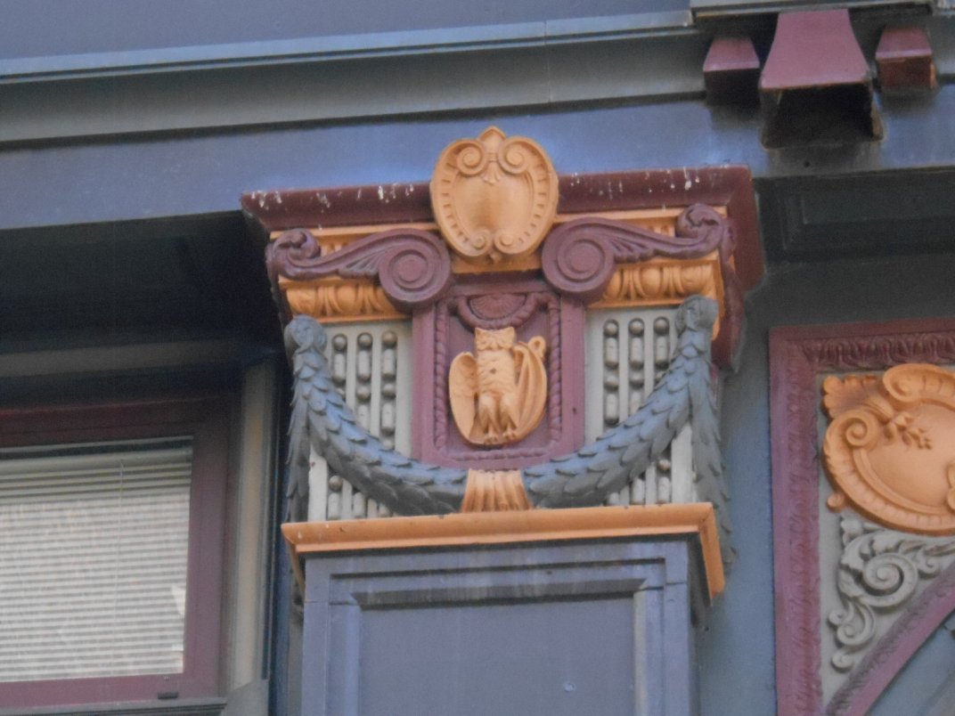 There are also far less threatening carvings or reliefs.  With this building that was once a nineteenth-century performance center, we have musical instruments:  mandolin and horn on one side and lyre on the other.