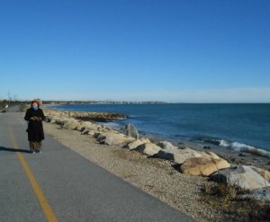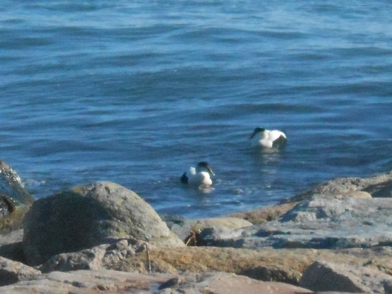 Two Fridays back, Yang and I happened to be on the North Shore, so we stayed overnight in order to make an early visit to Halibut Point State Park. We’d been meaning to get there since November, after hearing about all the cool water fowl hanging out there. Unfortunately, the opportunity hadn’t come up before this. So, after our breakfast of bagels and cream cheese (yum!), we headed out to the state park. We were not disappointed. In the quarry, we spotted a Scaup, Black Ducks, and Mallards. When we headed for the ocean, we got an even bigger treat. Here you see me peering out at the ocean’s wonderland – or wonderwater- of ducks. Isn’t that point beautiful?