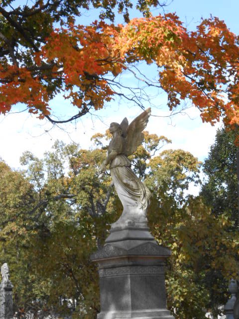 Three years ago, Yang and I took an autumnal visit to Woodlawn Cemetery in the Bronx.  This was our second visit.  Our first was in the summer, and we took many woodlawn1photos of the gorgeous sepulchres with their ornate carvings of lions and sphinxes, as well as beautiful stained glass inside.  This time, with the fall leaves beginning their metamorphoses into vivid colors, we concentrated on the outdoor imagery.  I love the way this angel is framed by the flaming curve of the branch and leaves above it.