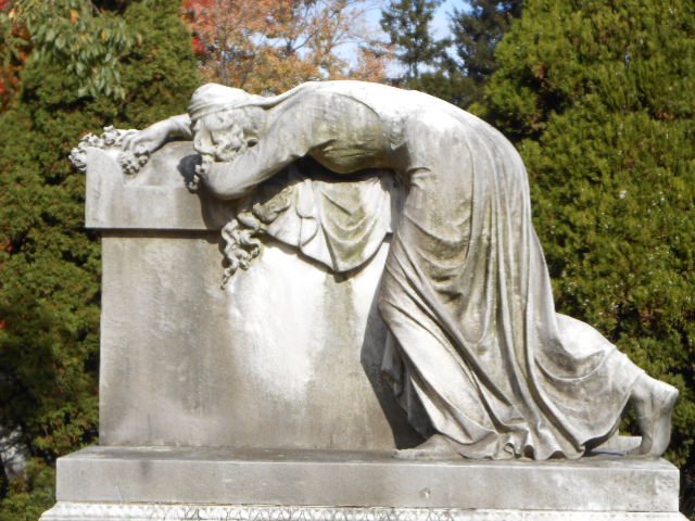 I was intrigued by this praying woman, high atop her monument.  woodlawn11She almost has an aspect of the Catholic Virgin Mary, not what you would expect in a seemingly predominantly Protestant cemetery.  Again, the autumn trees provide a pleasurable contrast to the cool white and grey-aged stone.