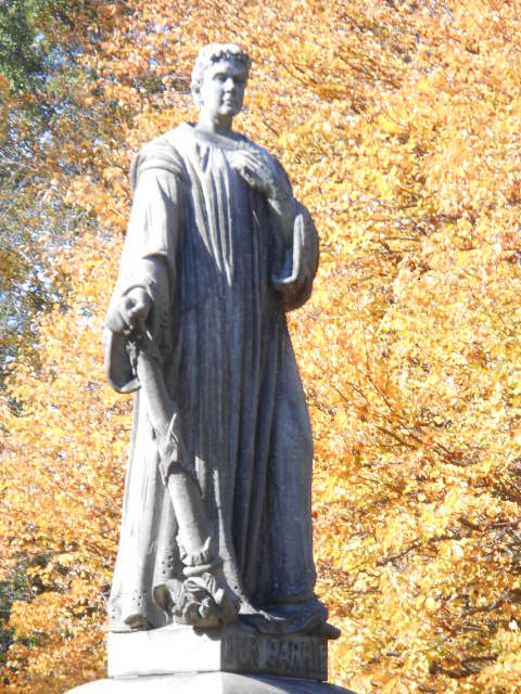 I’m fascinated by this monument.  My guess is that the chap memorialized in Roman senatorial garb must have been a judge or a  high political figure. woodlawn3 I hope he met a better end than Julius Caesar!  I thought the warm orange of the tree behind his imposing statue made an appealing contrast.  Stern but not harsh features on this chap.