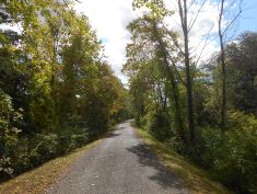 Here’s how the trail looked as we were starting off.  You can see the leaves subtly shifting from green to soft autumn yellow.  At the beginning of the trail, they created an almost chilly canopy, but not too cold.  It was a gorgeous, sunny fall day, with  bright sunlight and a soft blue sky.  The perfect day for a bicycle ride! There were also hints of red sumac and orange maple splashing through the green and yellow, creating beautiful early-autumn accents. You can see the river and the opposite bank through the trees as well. Don’t these berries also add a wonderful dash of contrasting color?