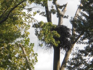 We wanted to make sure we got in  a ride before too late in the season because the trail officially closes from November to April while the resident bald-eagle couple nest and raise their young.  Sometimes they nest earlier than usual, so we lose out on a fall ride.  The swift-flowing Connecticut River on one side and its attendant canal on the other provide them with plenty of fish and other tasty treats. As this picture shows, the nest is close enough to the trail for the eagles to be disturbed by passersby.  Anyway, take a gander at that nest.  Enormous, isn’t it?