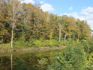 Toward its far end, the trail passes across a lake.  This area had once been a vacation resort, but now, as a public trail, anyone can go there to fish, boat quietly, or just enjoy the view. Dscn2868 There are some benches in the woods overlooking the lake that afford a lovely relaxing outlook.  Once, Yang and I took our tea and scones there to sit and have breakfast and enjoy the beautiful vista.  We saw scores of dragon flies and baby fish. We’ve also seen a Great Blue Heron here in the past.  I think Sterling7I might even have done some reading.  Where a bridge carries you over the lake, you come out into the sunshine, and it’s such a pleasurable view!