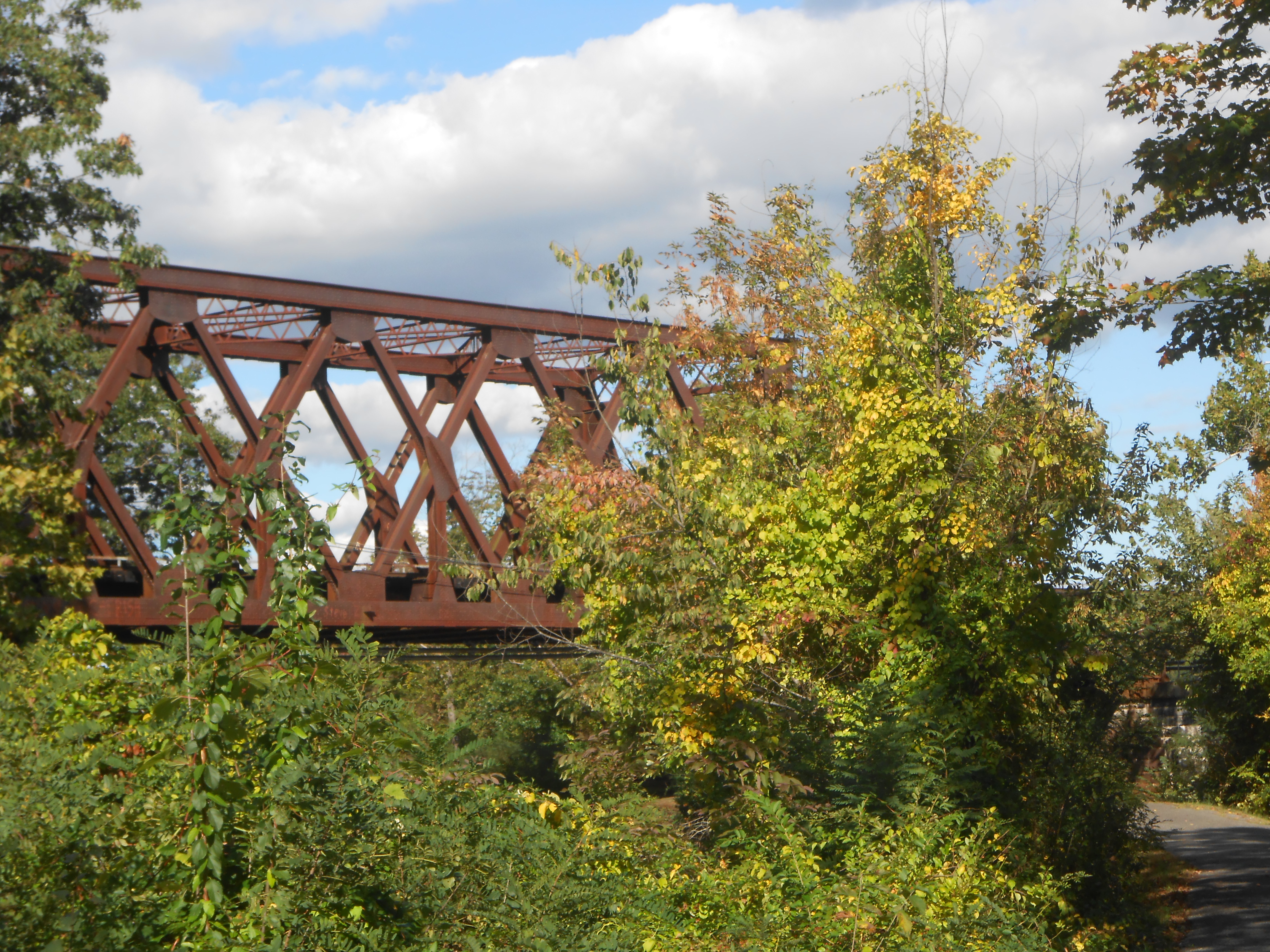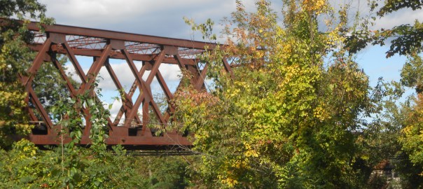 I love the way the bitter-sweet-yellow leaves and softening greenery embrace and curve about the rusty maroon of the railroad bridge here.