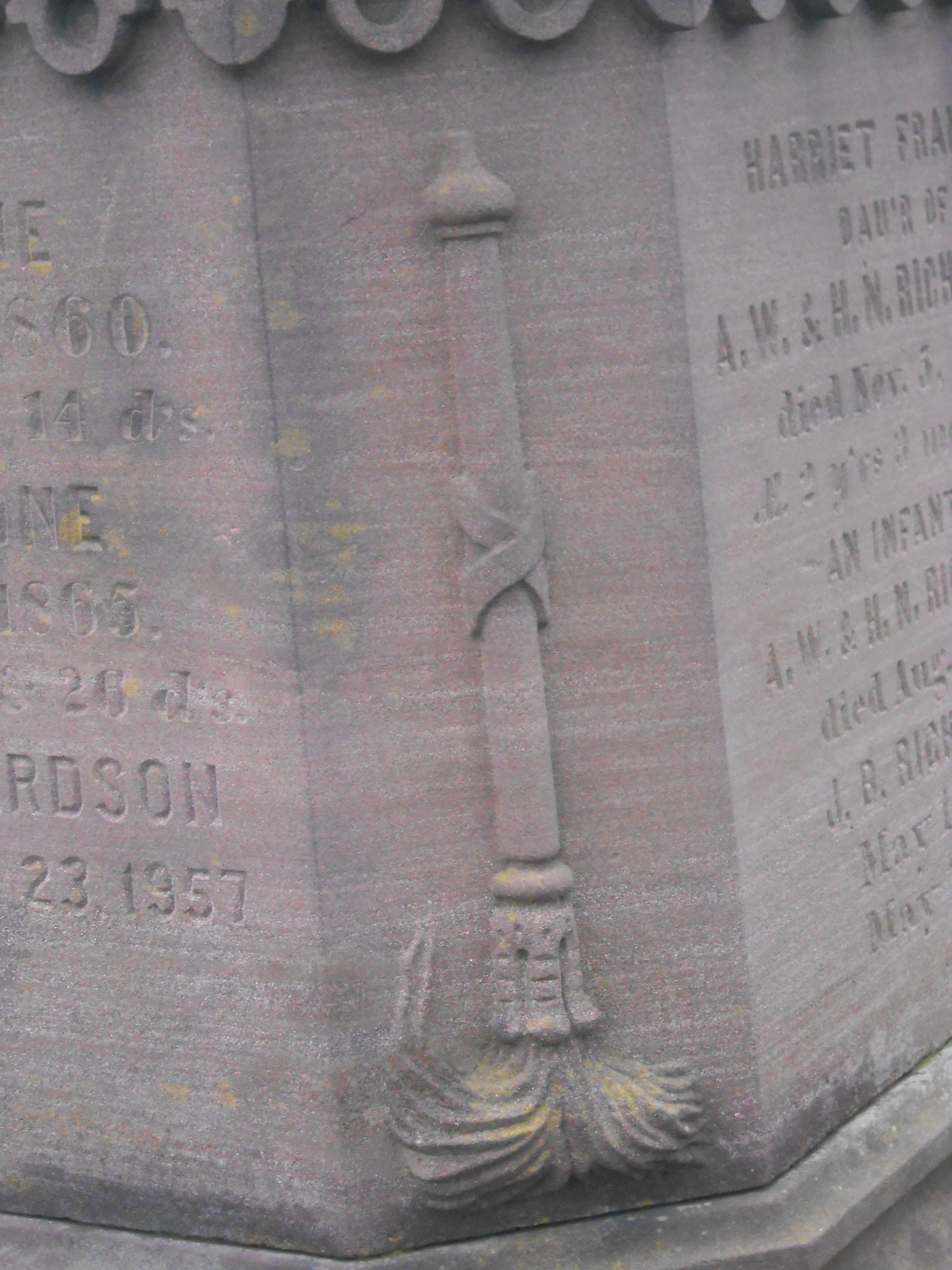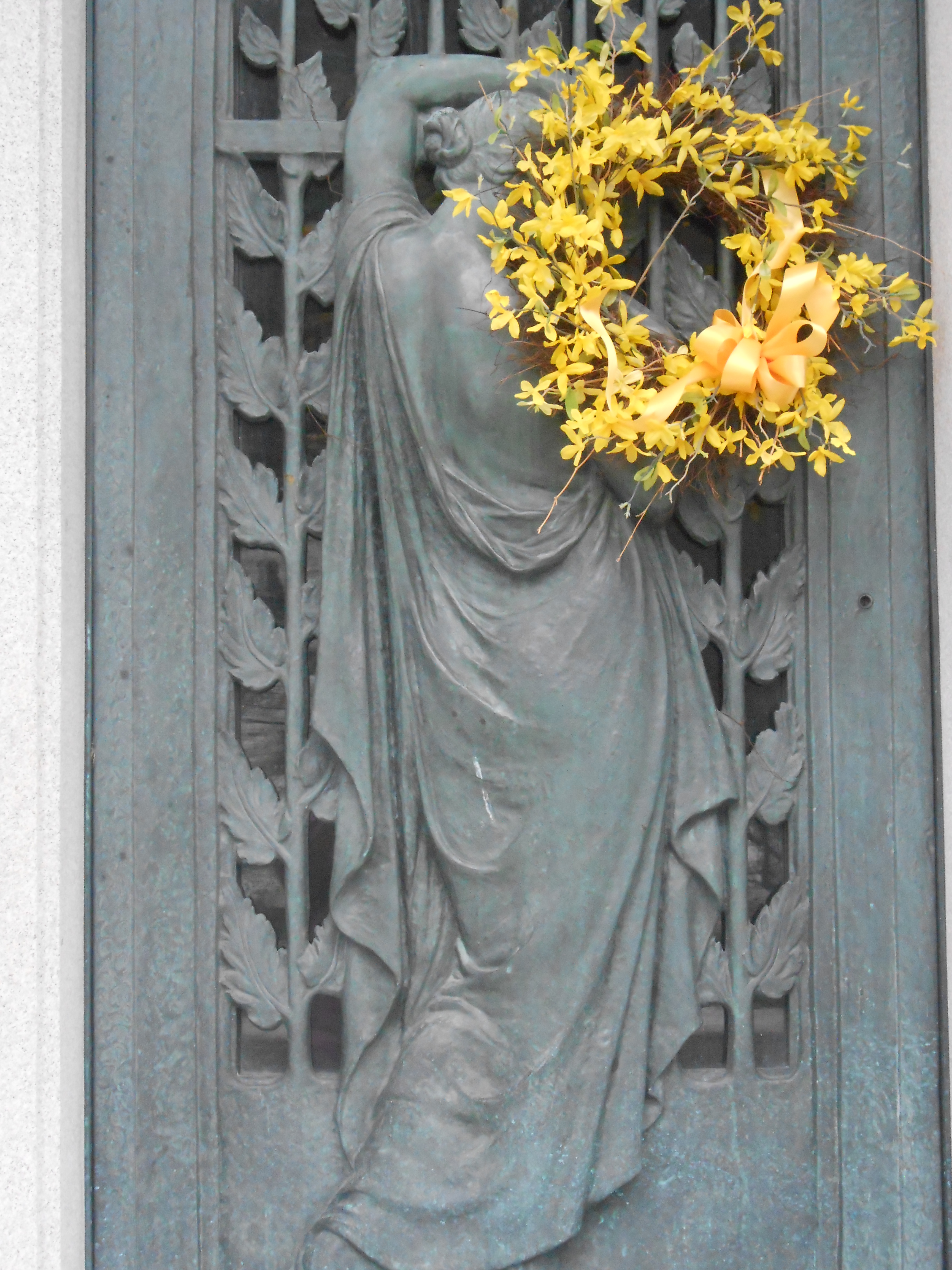 and snow have not been kind to them, gradually wearing them down to softened blurs in many cases. The dove embracing this shrouded cross has lost its distinctive features and now softly merges into the cross’s drapery. The child and the lamb, representing her innocence, have melted into the seat of broken rocks symbolizing her life cut too short, too soon. A