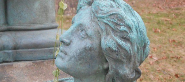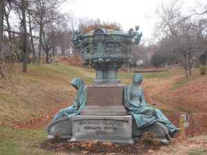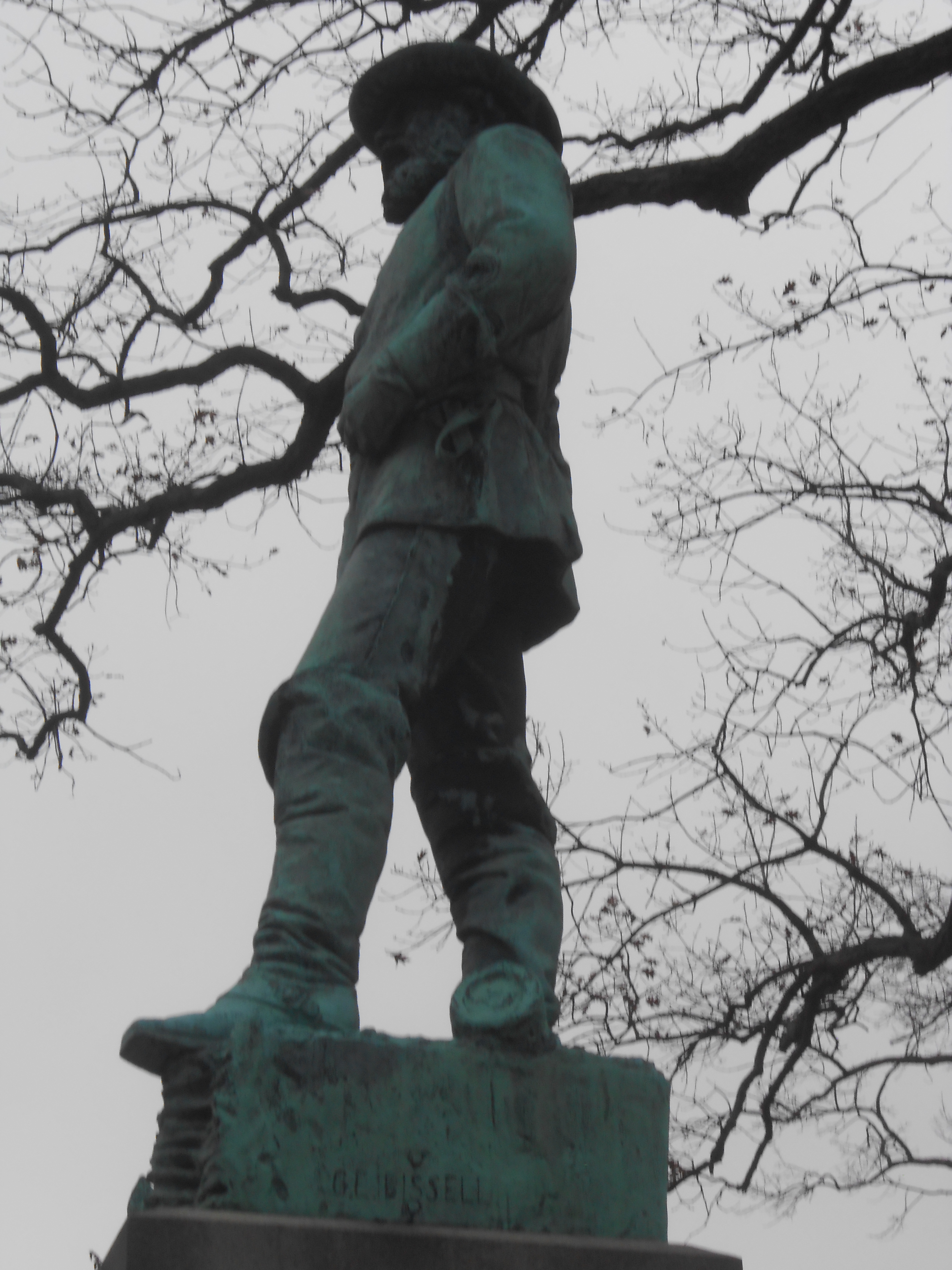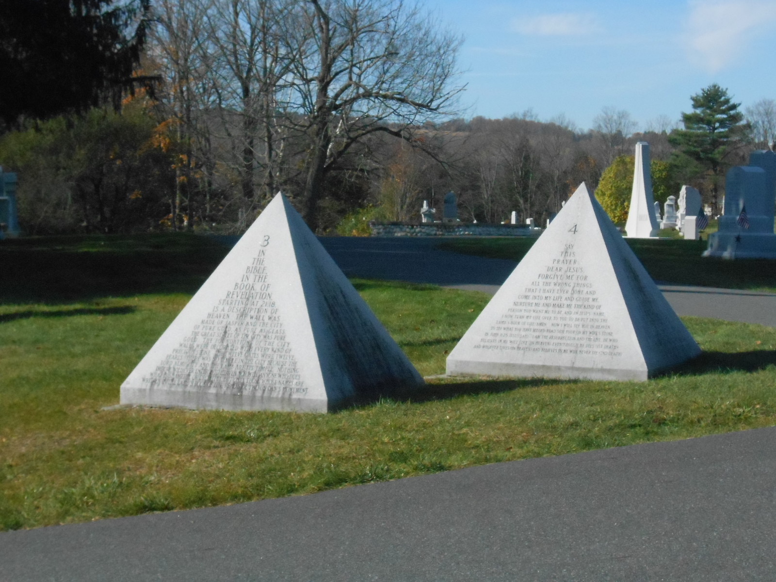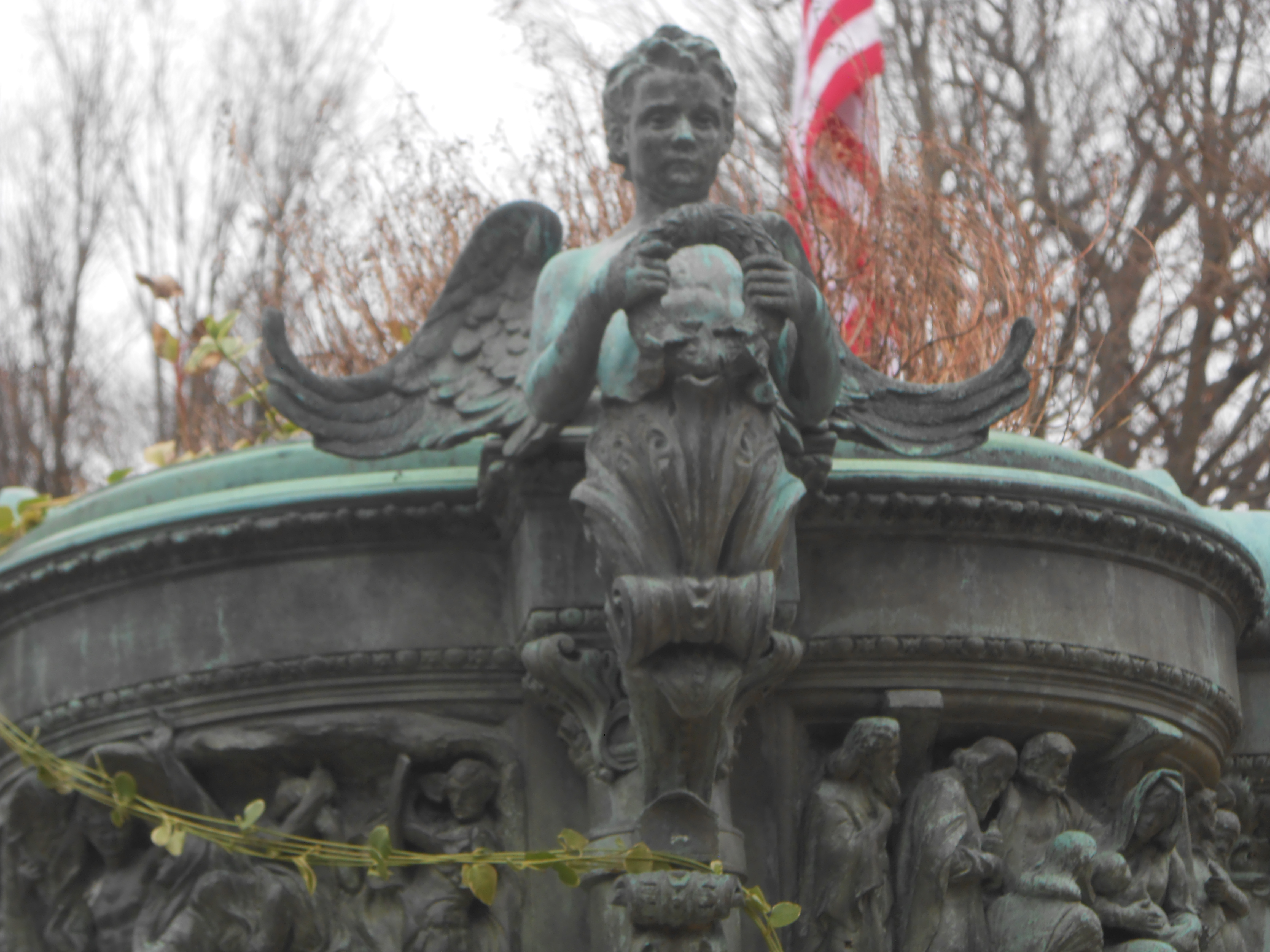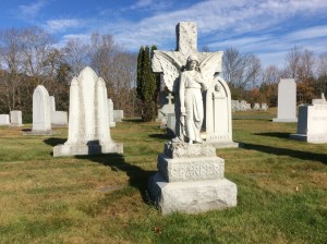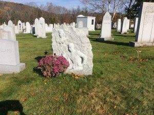 Of course, we stopped first in Seymore for tea at Tea with Tracey, where I enjoyed a delicious fig and cherry tea and Yang took pleasure in a nice green tea.  The array of tea sandwiches was yummy, and soon we were well fortified for our expedition into the past of Waterbury through its monuments to the passed. The day was appropriate, with grey skies and a nip in the air.  As you entered, you are greeted with an exquisite monument to the Elton family. The bronze has turned a soft green, but the female figures flanking either side of the memorial urn are beautifully articulated.  On one side is a shrouded figure of grief at death and on the other a hopeful one looking upward serenely.  The execution of the figures is graceful and feeling.  Interestingly, the handles of the urn are cherubs, somewhat menacing in demeanor. I think it’s kind of neat that the man’s name is John Elton. Reverse the order and you have . . .