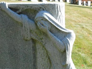 This statue was particularly intriguing, for the base was not a smooth column, but in the shape of a cairn, with the information of the family’s deceased inscribed on the individual stones. I’m fascinated by the creativity of the masons who contributed to the Riverside Cemetery.  Their statuary is amongst the most unique I’ve encountered in my explorations of cemeteries.