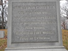 There were several others who were clearly prominent in the town, indicated by the plaques on their graves or the imposing nature of their monuments.  One interesting sort was the Civil War veteran John Lyman Chatfield.  This plaque tells the story of his wounding on the battlefield and subsequent death back in Waterbury.  The bronze statue of him in uniform further attests to his history as a Civil Warrior.  The Chatfield family must have been one with tremendous clout in the city to be able to leave such an imposing monument.  Any local historians want to fill us in on more about him?