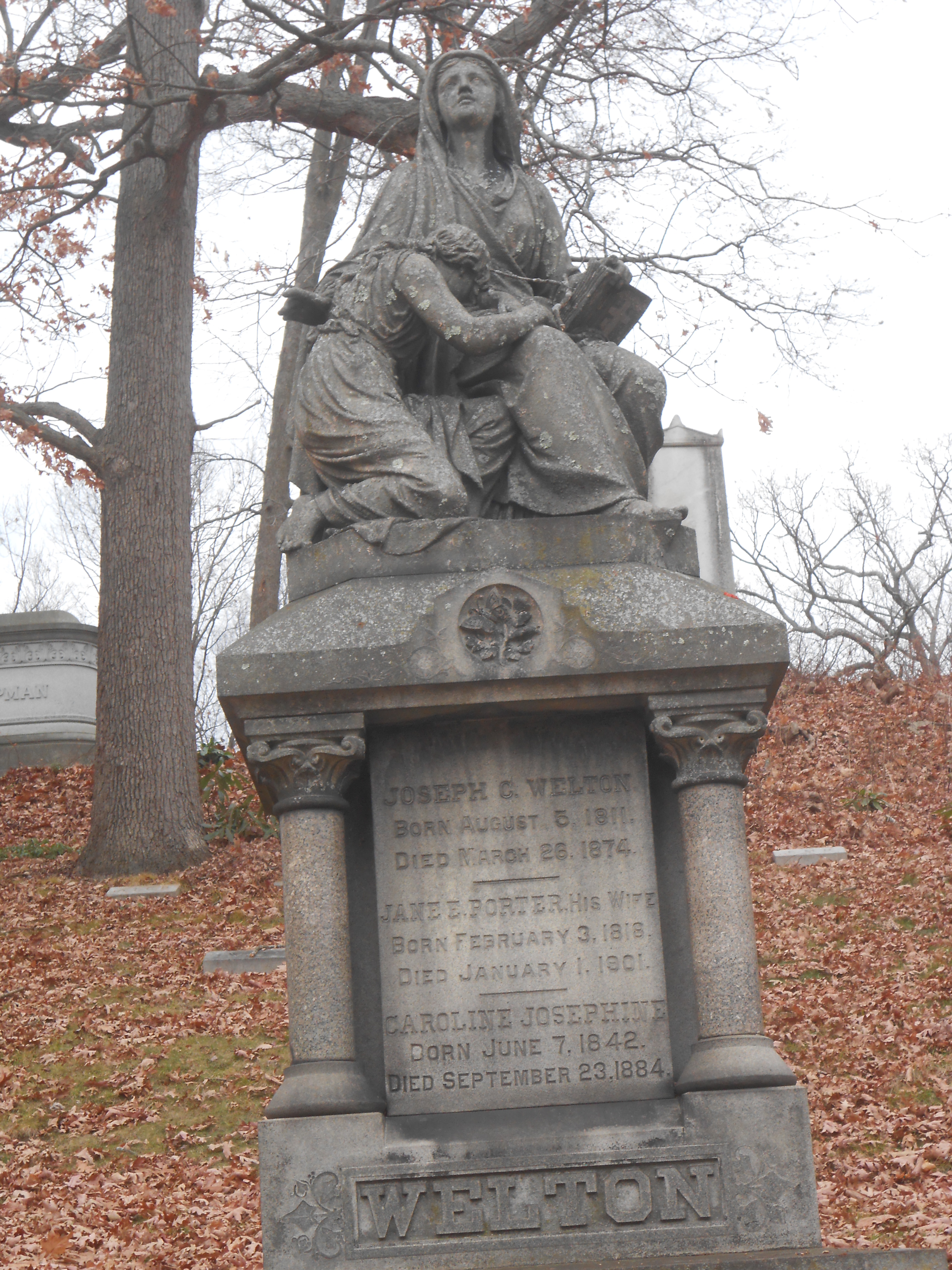 This statue of woman and child from another branch of the Welton family seems to portray a sad loss.  Did mother and child pass when both were young or are they immortalized as eternally young in the next world?  The child seems afraid, burying herself in the comforting lap of her mother, who has one arm  around her but raises her hand hopefully, while the other holds a book and looks into the beyond. Is she holding the Book of Life or the Bible?  Her steadfast stare and gentle but firm hold on her daughter  indicates her guidance of her family toward redemption.  This seems a statuary representation if the Victorian Angel in the House.