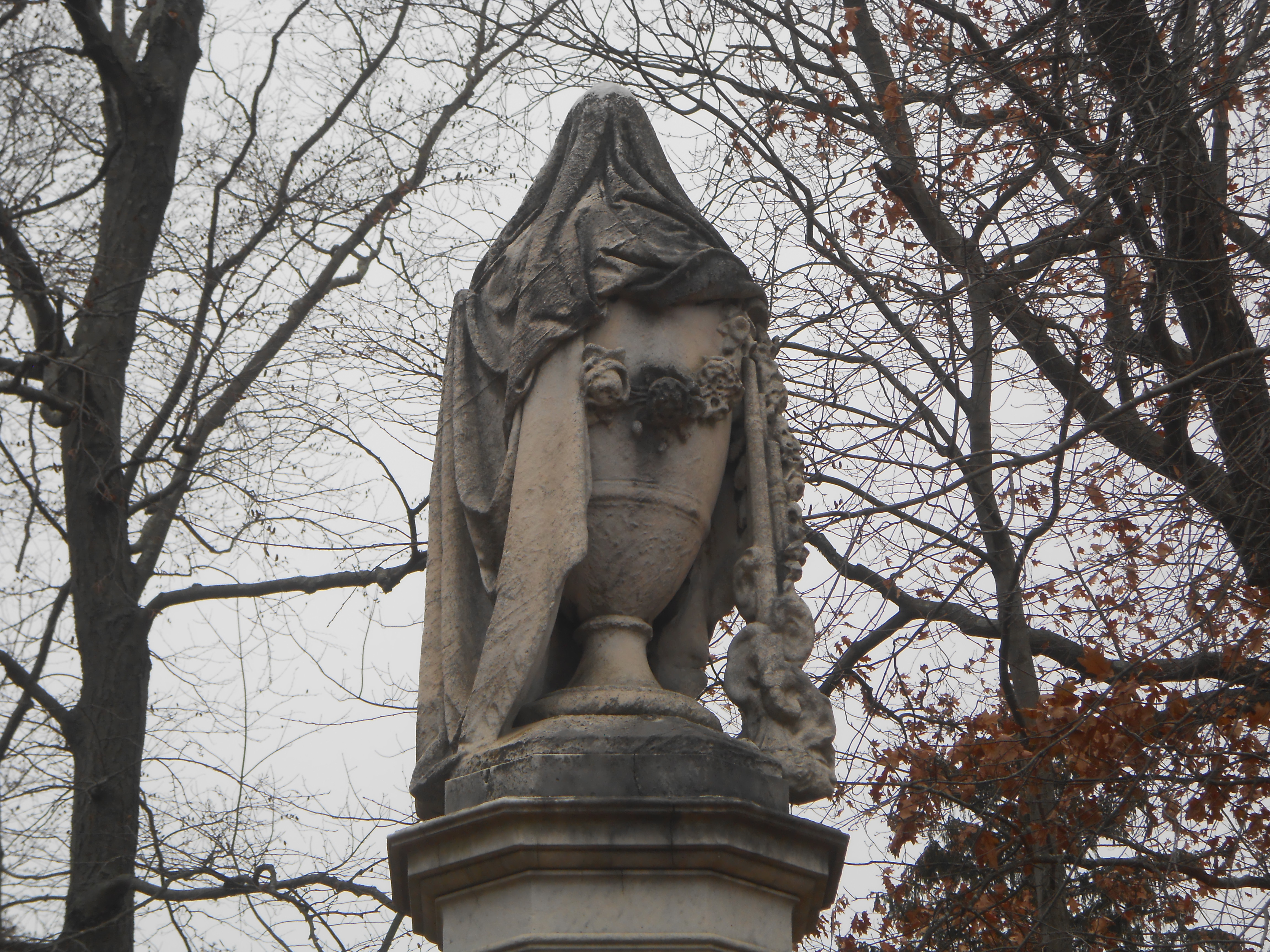 Now this statuary tremendously intrigued me.  Coming upon it from behind, both Yang and I thought it was a spectral figure in a shroud, a figure implying the mystery of the world beyond this. However, as we came around the front of the monument, we realized that what you saw from the front was a partially  draped urn.  This leads me to wonder if the artist intentionally played with our perceptions, implying the ineffablity of pinning down or defining death.  Was he, perhaps, implying our thoughts of ghosts and spirits turn out to be nothing more than dust in a dead stone urn?  Or was he implying that perception of death as final dissolution into dust and cold stone was a superficial view that we have to look behind or beyond to accept the mystery of the world beyond? Maybe I just think to much?  I was an English professor; it’s an occupational hazard.