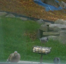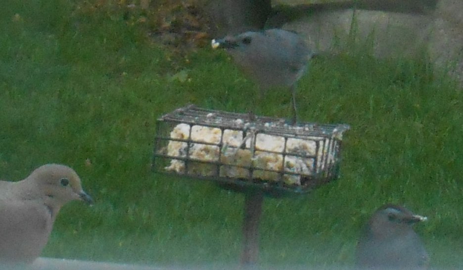 DSCN5885The catbirds used to come frequently in the beginning of the summer, then they disappeared, pretty much, for about a DSCN5979month.  However, now they are BACK.  And they are aggressively defending the suet, cocking up their black tails and showing off that red spot underneath.  I’m glad to see them-and hear them call my name, “Sharon! Sharon!”  There’s one outside my window right now!