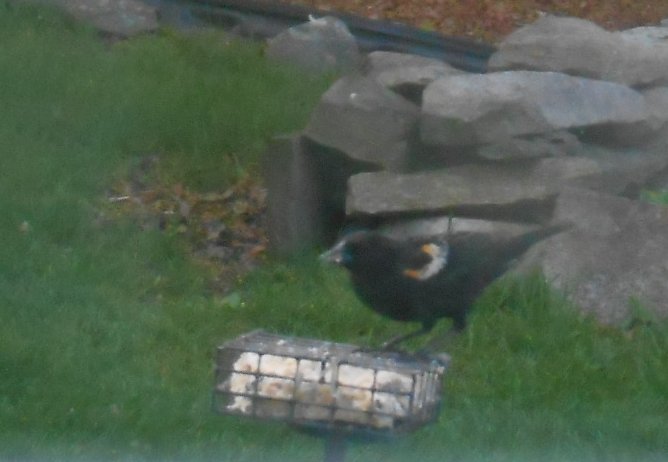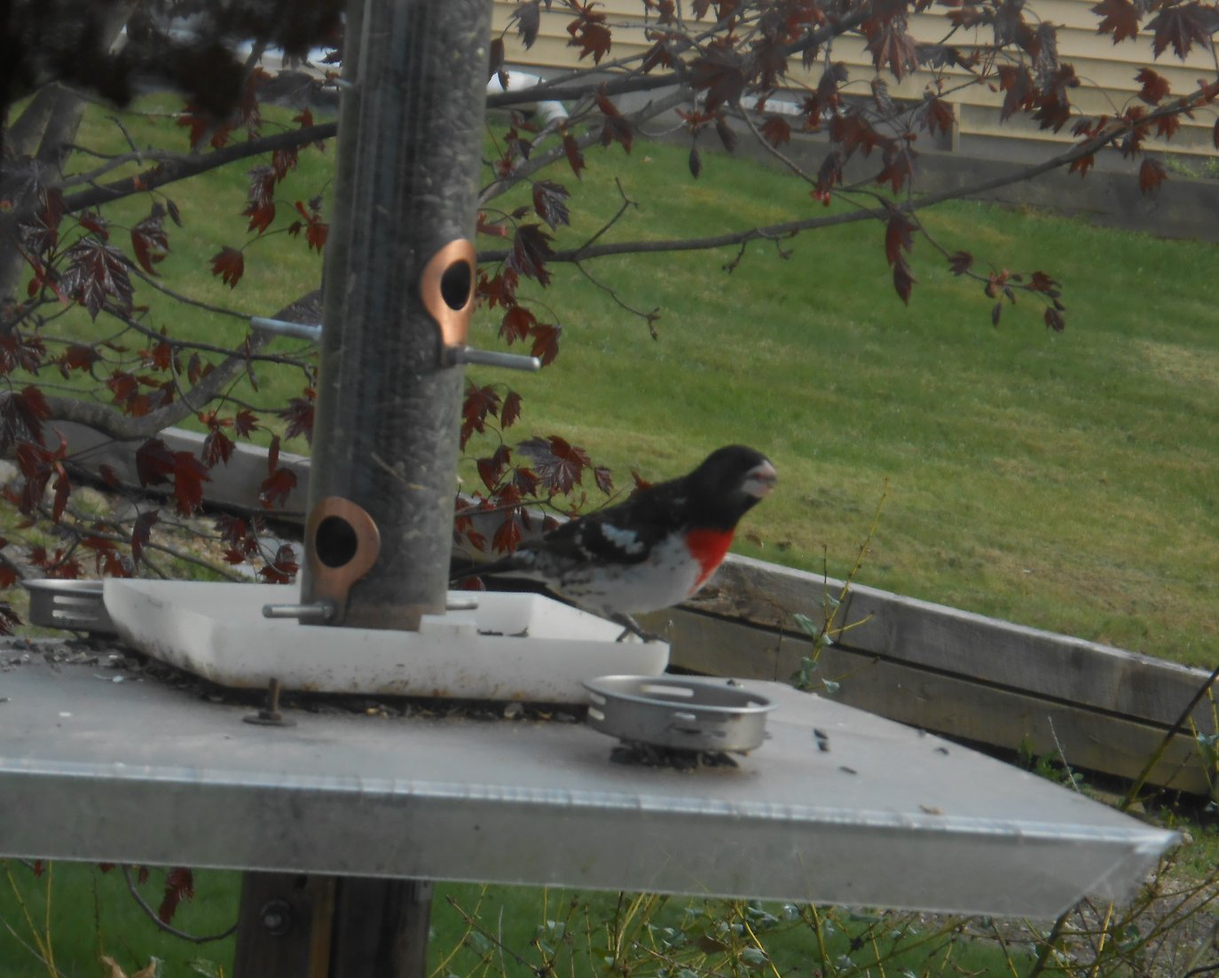 We really hit the jackpot this week! Shortly after spotting a sleek, coppery fox gamboling in my yard, Rosalind focused my attention on the backyard feeder, and what did I see but a male Rose Breasted Grosbeak (5/8)! The next day, I heard a lovely birdsong (not Cindy) in the trees, and when I investigated, I saw the Grosbeak again! I’ve seen him at least once a day since, usually feeding on suet or black oil sunflower seeds. He’s quite the cheeky fellow, for when I was feeding the fish in our small pond, he sang me a song. When I repeated it back to him, he popped over to the nearby birdfeeder and chowed down for some time. This morning, he finally brought Mrs. Grosbeak to one of the feeders. I’m glad that these Grosbeaks are not easily intimidated by Grackles, Blue Jays, or Mourning Doves.