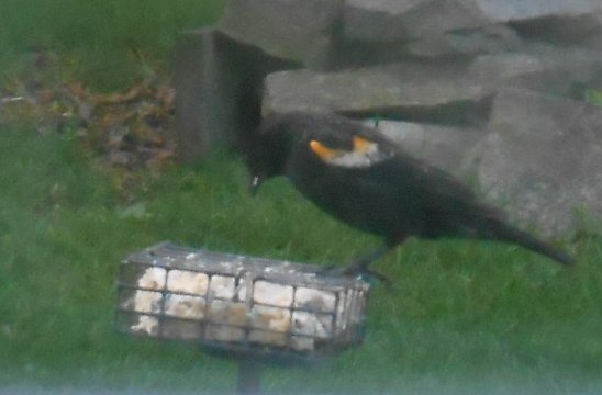 The snow has finally been gone for some time now. Even though it’s raining and chilly today, we’ve had a whole week of sunshine and warm weather with just a touch of rain to treat the thirsty plants. And our spring birds are back! April brought a caravan of wild turkeys, one at a time, through my yard and past my sun porch. Though I was too busy watching them to take a picture, I did get some shots of one of my favorite avian harbingers of spring, the Redwinged Blackbird. He showed up at first on March 3rd, then I gradually saw more males flashing their yellow and red epaulets. They sometimes get resistance from another spring returnee, the Boat-Tailed Grackle, but the Redwings are pretty staunch in defending their places at the feeder. Just over the past week or two, I’ve been seeing the female Red-wings show up as well.