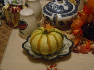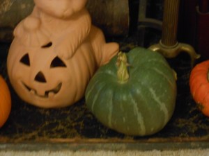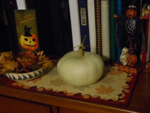 Here is Number Two Son on the dining room table-another place that we spend a lot of time.  He’s a bit bigger than his elder brother, and he is strong and handsome.  You can also see he shares the table with a lovely striped gourd.  Each of these was the only survivor on its respective vine, but both do the mother plant proud.  They certainly fit nicely with the Halloween decorations, don’t they?