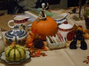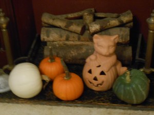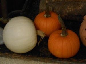 My last post was about the denizens growing in my pumpkin patch.  Now, I can write you about the harvest.  I still have one large orange pumpkin on the vine, and two embryos actually got fertilized about a week ago-who knows if they’ll make it.  However, most of the others are now decorating my house!