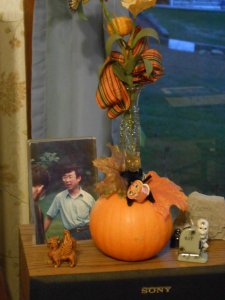 Number One Son is here in the living room, decorated appropriately for Halloween.  He may not be the biggest of the family, but he’s the brave first to be fertilized and survive.  He’s right next to the television, so we can see him all the time.