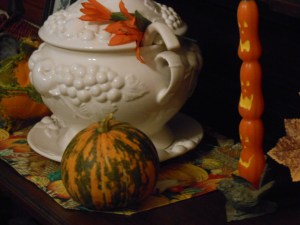 And speaking of handsome gourds in the dining room, here’s this gorgeous  melange of orange and green.  He’s a perfect fall color!  The first gourd on his vine grew for a while, but didn’t make it.  This chap grew up next, initially hanging from the fence where the vine had climbed.  His healthy form soon brought the vine down to earth.  Beautiful color and shape, wouldn’t you say?