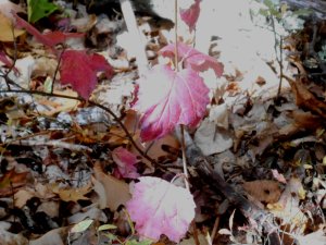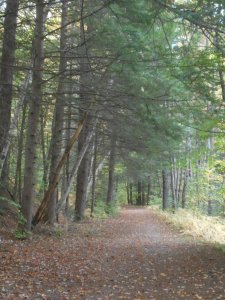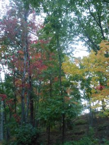 Walking into the woods of the trail, you see saffron, ruby, and orange flame emerge through the dark green trees not yet turned.
