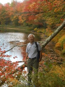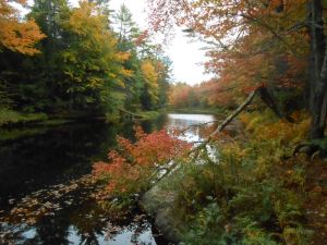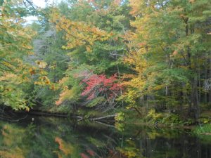 As the season progressed, we had a chance to go further afield, journeying to a trail outside of Peterborough, New  Hampshire.  Our walk through the soft light of green woods brought us to a lookout on a large rock extruding into the river.  Looking back, we could see the trees at the water’s edge were gradually putting on their  yellow and  orange finery.