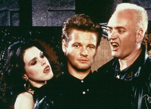 I find the characterizations and casting more compelling in the series, but of course a series gives more time for development.  Rick Springfield is good as a slick, cynically ironic, tough-as-nails but really decent detective/vampire, perfect for 1980s neo-noir.  Still Geraint Wyn Davies’ Byronic Nick has an emotional depth, an ability to reflect and regret and care, seasoned with a mischievous wit, that deepens his character.  Changes in the rest of the cast also prove more interesting in Forever Knight.  The supportive male coroner from Nick Knight is now played by the feisty Catherine Disher, and the romantic tension that bubbles up from time to time in Nick and Natalie’s friendship makes for an interesting evolution of the relationship that only the longer duration of a series better facilitates.  The movie’s Jeanette is a poseur at Continental finesse, whereas the series version of the character is an actual woman of the Old World (like Medieval France!), who is clever, witty, and definitely menacing.  Schanke is still kind of a jerk, but in the movie he’s just a jerk. In the series he’s smarter and less self-impressed. He actually becomes Nick’s friend. LaCroix is maybe the most interesting change, after Nick.  Nigel Bennett’s LaCroix in the series carries a wit and menace that leaves Michael Damon’s rather wooden interpretation in the dust.  Where Damon’s LaCroix is Nick’s age-contemporary, Bennett’s greater age and expertise lend an Oedipal twist to the relationship between master/mentor vampire and apprentice growing into independence.