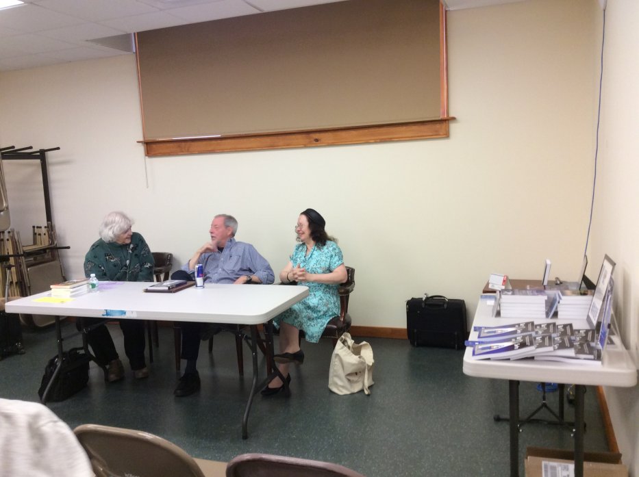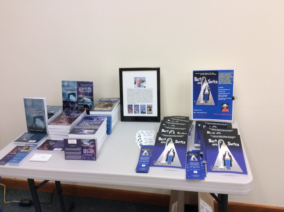 IMG_1936The Library is a beautiful little brick buidling that, like the Tardis, is much bigger on the inside than it appears on the outside.  Just to make sure we knew where we were going, Nancy’s signs pointed out our way into the charming, old New England building. IMG_1940Once there, I shared a table for displaying my books with Kevin Symmons, and the three of us got started talking about our writing and answering questions from a nice turn out of about 15 people. Kevin was our adept moderator.