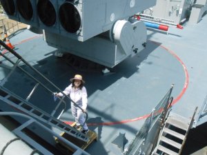 My Dad was a gunner on the Hudson, Sfc, but I don’t think he said he was on one of these monsters.  If you look at the second picture, you see the red circle warning you to stay outside the guns’ turn radius.  You wouldn’t want to get hit by this monster – unless you’d always had a hankering to turn into a pancake.  You’ll notice that I was going down the stairs here.  Too steep to descend facing down!  I think guys used to almost slide down with both hands on the rails.  But I could be wrong.