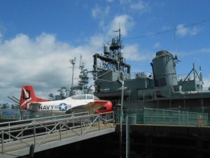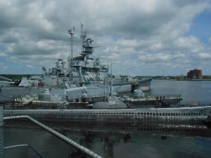 Last week, Yang and I finally got the opportunity to do something we’ve been promising ourselves for years:  visit Battleship Cove.  As someone who is fascinated by the WWII years and who had a father who served in the Navy, this was a special treat for me.  I’ve long heard of my Dad’s various adventures, both in the Armed Guard doing convoy duty in the North and South Atlantic and on the U.S.S, Hudson in the Pacific Theatre. Here’s a picture of the Hudson (DD475) from the USS Hudson Homepage.