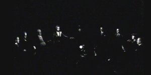 | Scott turned on the soft light, then crossed to the doorway to shut off the other lights in the room before closing the padded doors. Jessica barely noticed Scott retrieving a flashlight to guide himself safely around the equipment to his station with the technicians. She did notice that James was lost in the darkness beyond their soft table-glow. The underlighting before her likely made Wanda a distinctly eerie silhouette to the audience.